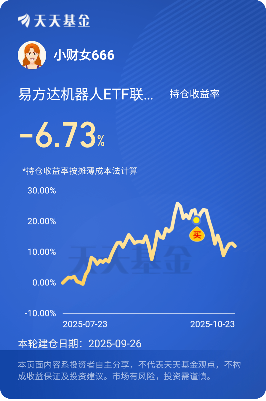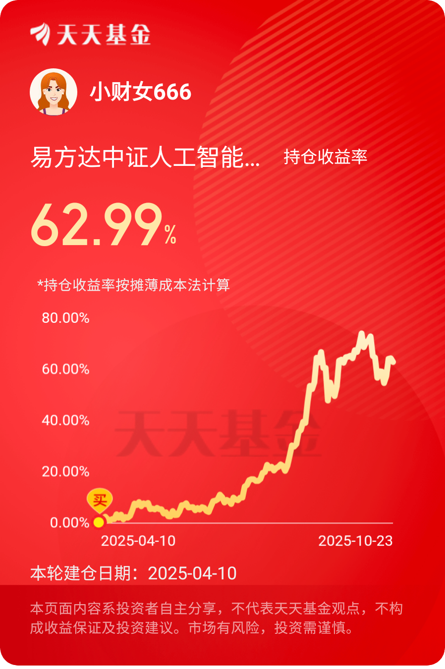 今年以来,国家高度重视科技发展,加大扶持力度,人工智能、自主芯片、创新药出海等成长板块发展势不可档,我坚决看好。我也一直持有$易方达中证人工智能主题ETF联接C(012734)$ @易方达基金