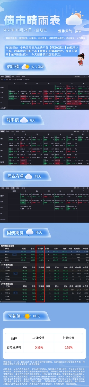 先说结论:今晚信用债为主的产品【微涨或挂0】的概率大一些,利率债为主的产品【微跌】的概率较大,存单【微跌】的可能性较大。今天整体债市盘面多云