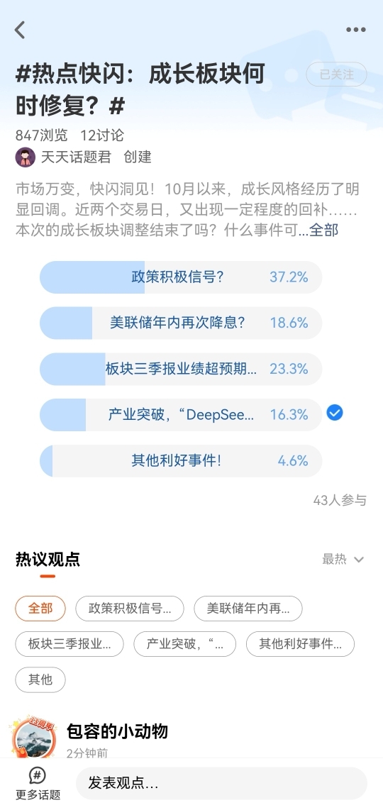 我在#热点快闪:成长板块何时修复?#选择了“产业突破,“DeepSeek”时刻再现?” 。