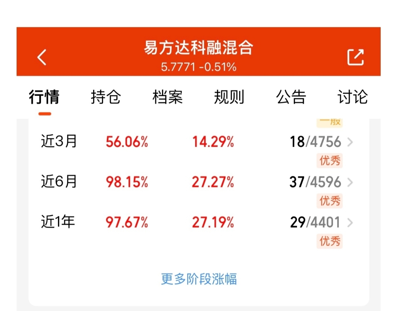 最近市场确实挺折腾的,板块轮动跟走马灯似的。我观察易方达科融这只基有一阵子了,发现它挺抗跌的。三个月涨了56个点,确实不错。主要投的是科技、新能源还有军工这些热门赛道,但又不是all in某一个,分散得挺好。
