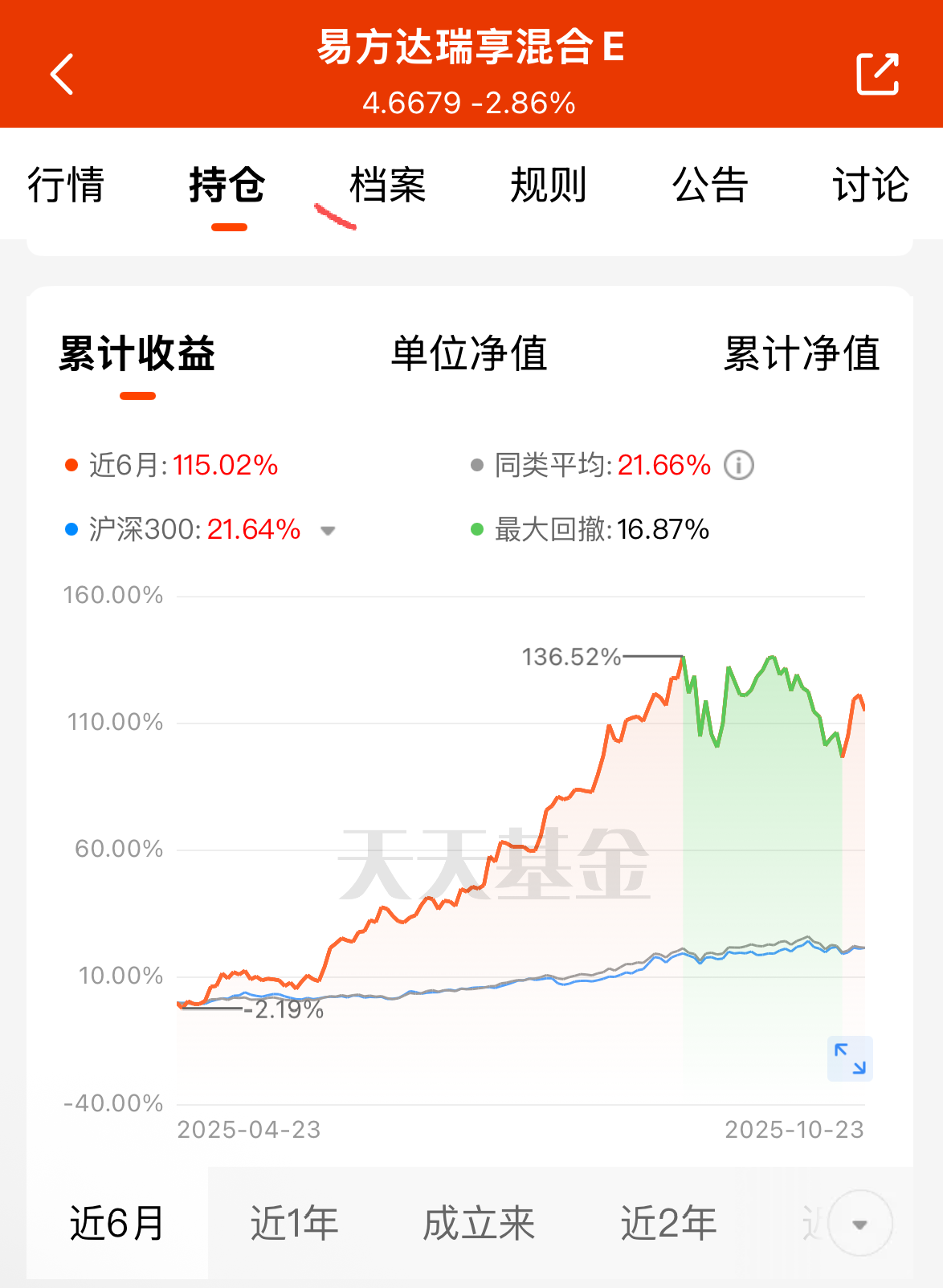 要说涨幅给力的!还得是cpo啊老铁们!是谁说cpo不行了哈哈哈,前两天回调吓退了多少铁汁,今天一根冲天大阳线收复失地!易方达瑞享混合E,近六月115.02%,经理的眼光还是很不错的,过往调仓一直都很有自己的想法,坚定的狠,继续看好!