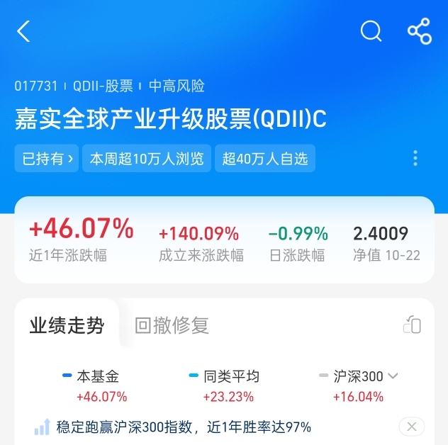 $嘉实全球产业升级股票(QDII)C$ 可作为关注方向,其布局了英伟达、超威半导体等科技龙头 ,近三个月涨27.78%,近一年收益46.07%,业绩在同类中领先 。随着资金向全球产业顺周期切换,后续有望稳步发力。