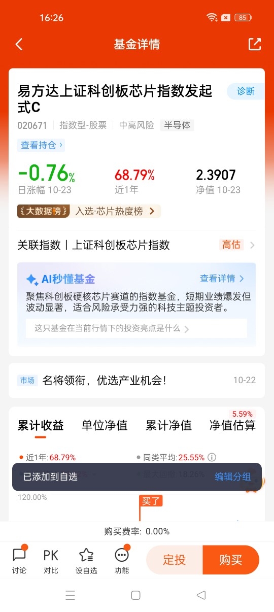 所持基金具备精准捕捉行情的能力。该基金股票资产占比达91.77%,紧密跟踪覆盖全产业链的科创板芯片指数,能充分分享板块红利,其2025年三季度63.57%的阶段涨幅显著跑赢同类平均 。C类份额的费率设计更适配中短期反弹行情,降低持有成本。