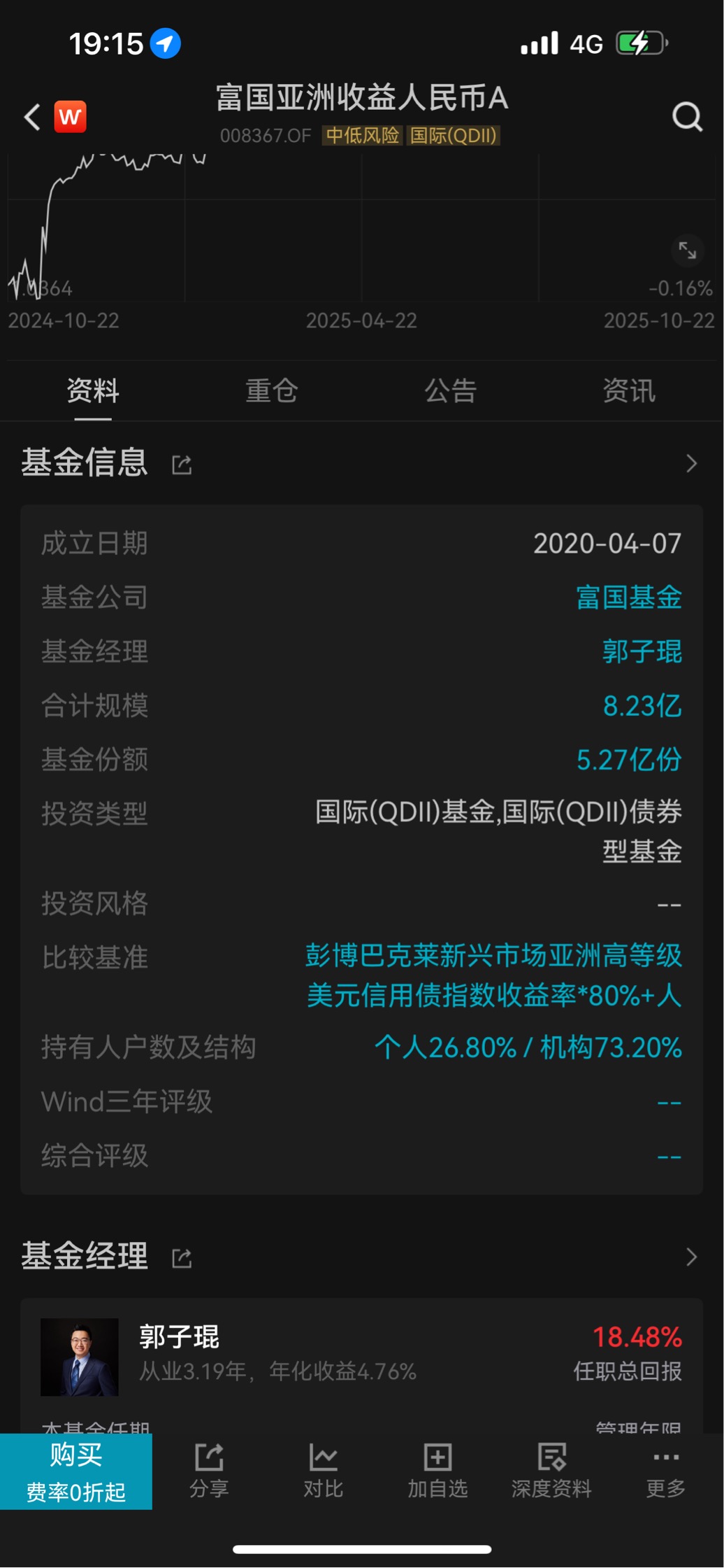 按照目前组合和微博单基的持有量,如果把我们粉丝当成一个整体的话,可能我们已经是$富国亚洲收益债券(QDII)人民币A$ 最大的单一持有人了,在一定程度上我们已经可以影响这只产品的流动性和投资策略了