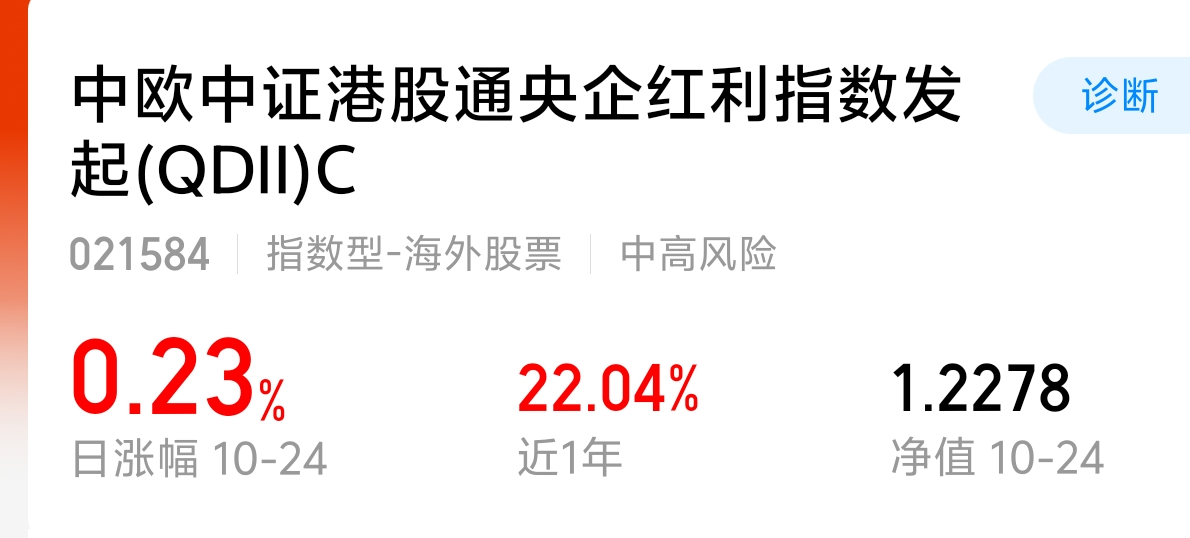 今天市场行情火爆,赚钱效应明显,持有的宝子都赢麻了吧!值得留意的是,$中欧中证港股通央企红利指数发起(QDII)C$ 今天防御型的红利也不错,中欧中证港股通央企红利今天涨幅0.23%,很不错哦!近一年涨幅22.04%,其近一年业绩也是很优秀的哦