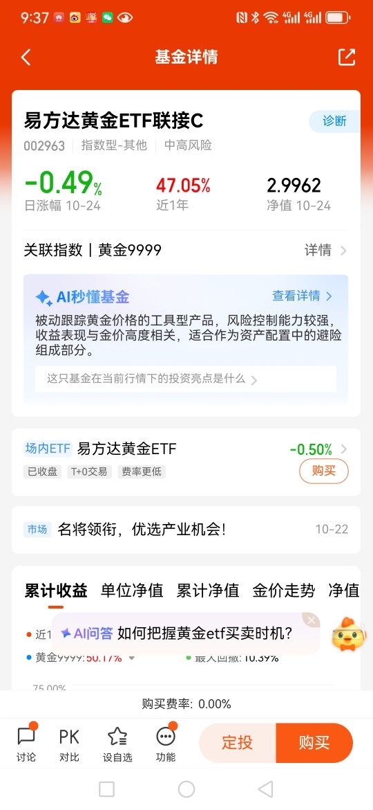 今年以来黄金走势强劲,$易方达黄金ETF联接C$ 这款基金正好为投资者提供了一种便捷、安全、透明的黄金投资方式,而且费率最低,可以节省投资成本。无论是追求资产保值增值的稳健投资者,还是希望在黄金市场中获取超额收益的激进投资者,$易方达黄金ETF联接C$ 都值得一试。