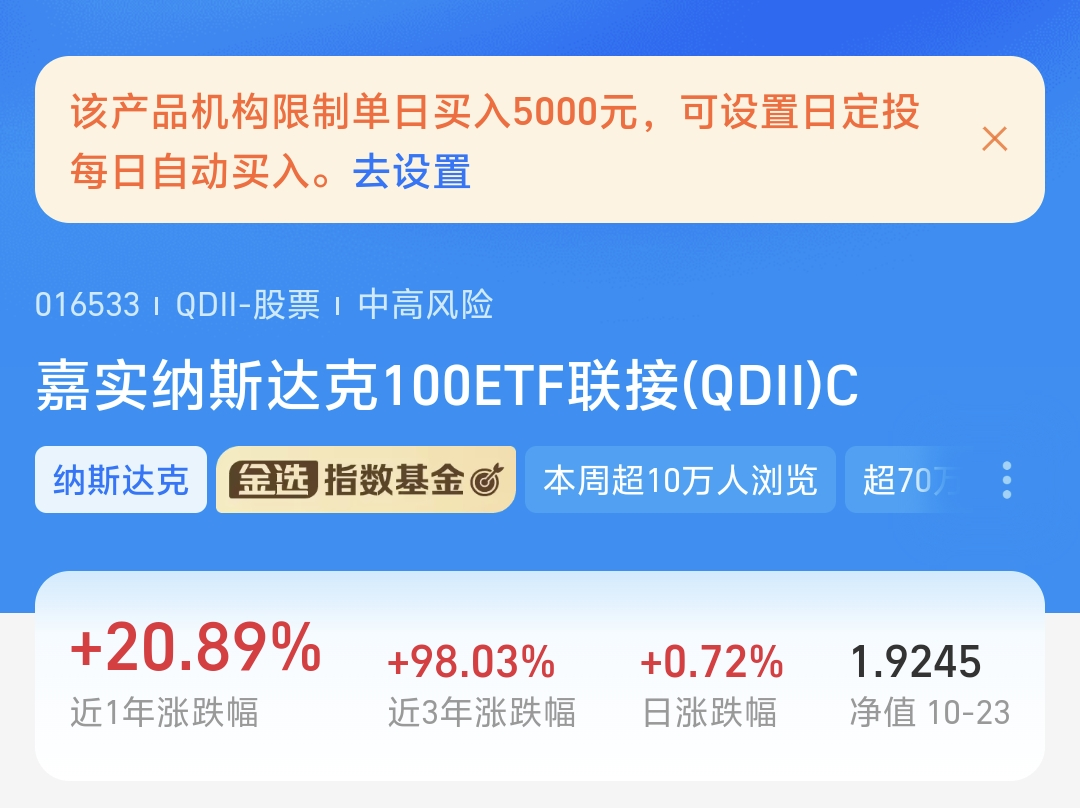 长期来看$嘉实纳斯达克100ETF发起联接(QDII)C人民币$ 的表现确实跟上了科技行业发展的步伐。这个产品单日申购额度是5000元,里面汇聚了百家国际知名的科技企业。