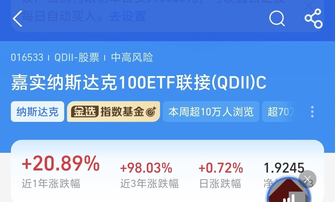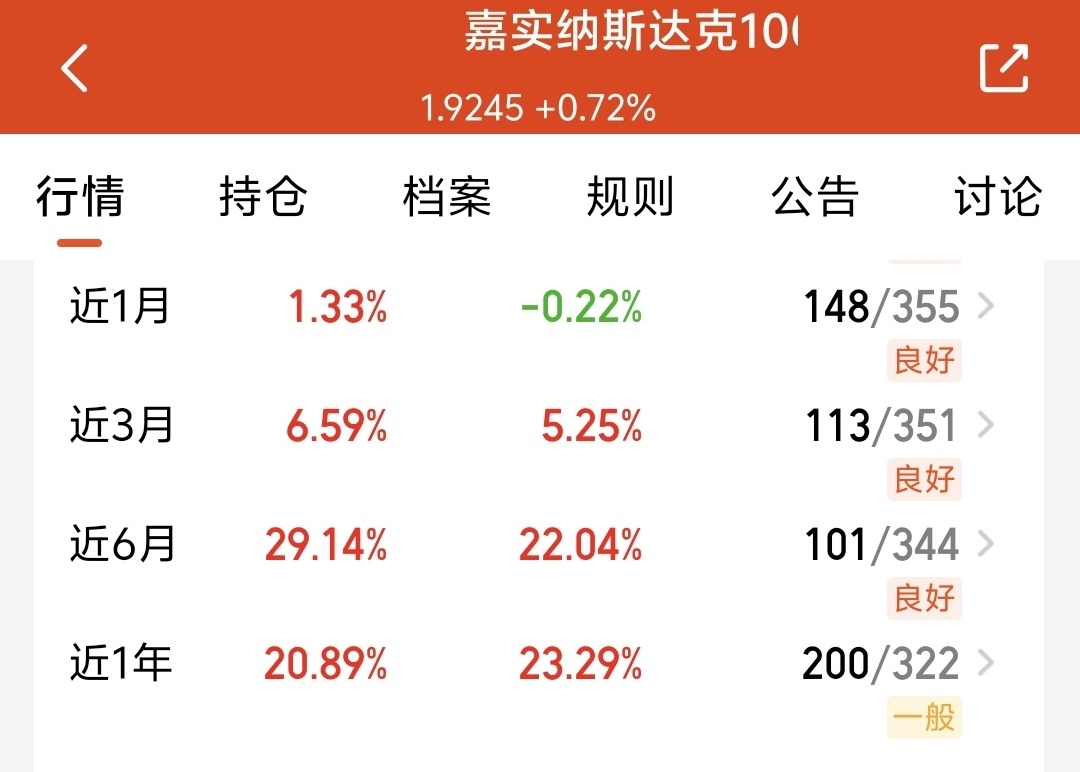 美股市场又好起来了,科技开始反弹了,$嘉实纳斯达克100ETF发起联接(QDII)C人民币$ 就是专门关注这个赛道的。它紧密跟踪纳斯达克100指数,把苹果、英伟达等100家顶尖非金融企业打包纳入,AI浪潮下核心科技资产一网打尽 。指数经权重再平衡后,龙头布局更均衡,盈利驱动特征显著,近6月涨幅29.14%,表现不错。目前已经限额5000元,不过还是比其他额度高。更贴心的是C类份额优势:短期持有免申购费,交易灵活,15.61亿规模兼顾流动性与稳定性 。