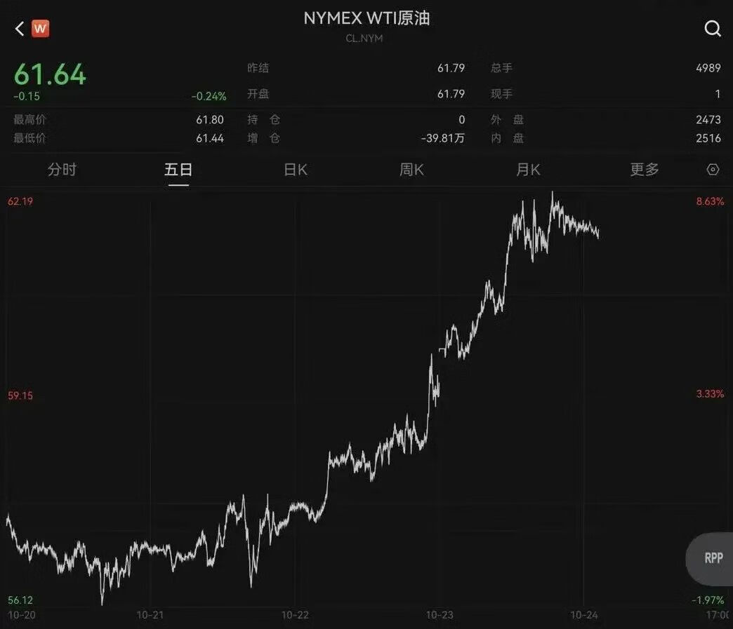 下图,是美油的五日线,可以看到,其从低点的56美刀左右,近期持续反弹了10%左右,背后的原因,昨天已经提到过。