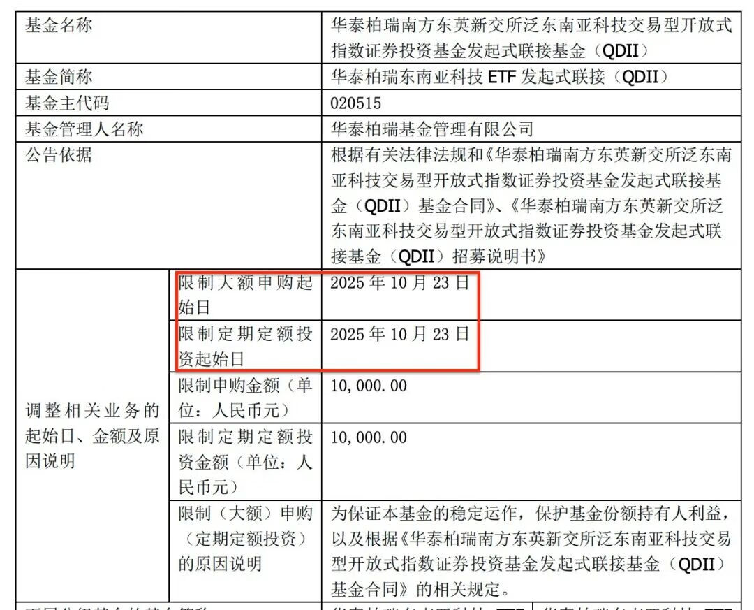 下图,表韭全球的持仓基金,东南亚科技ETF的联接基金,昨日公告,其单日限额,从此前的2万,下调到1万,虽然表韭全球对其配置的比例不高,因此,1万的限额不影响大家跟投表韭全球的体验,但要说的是,这个持续限购,会是一个趋势。