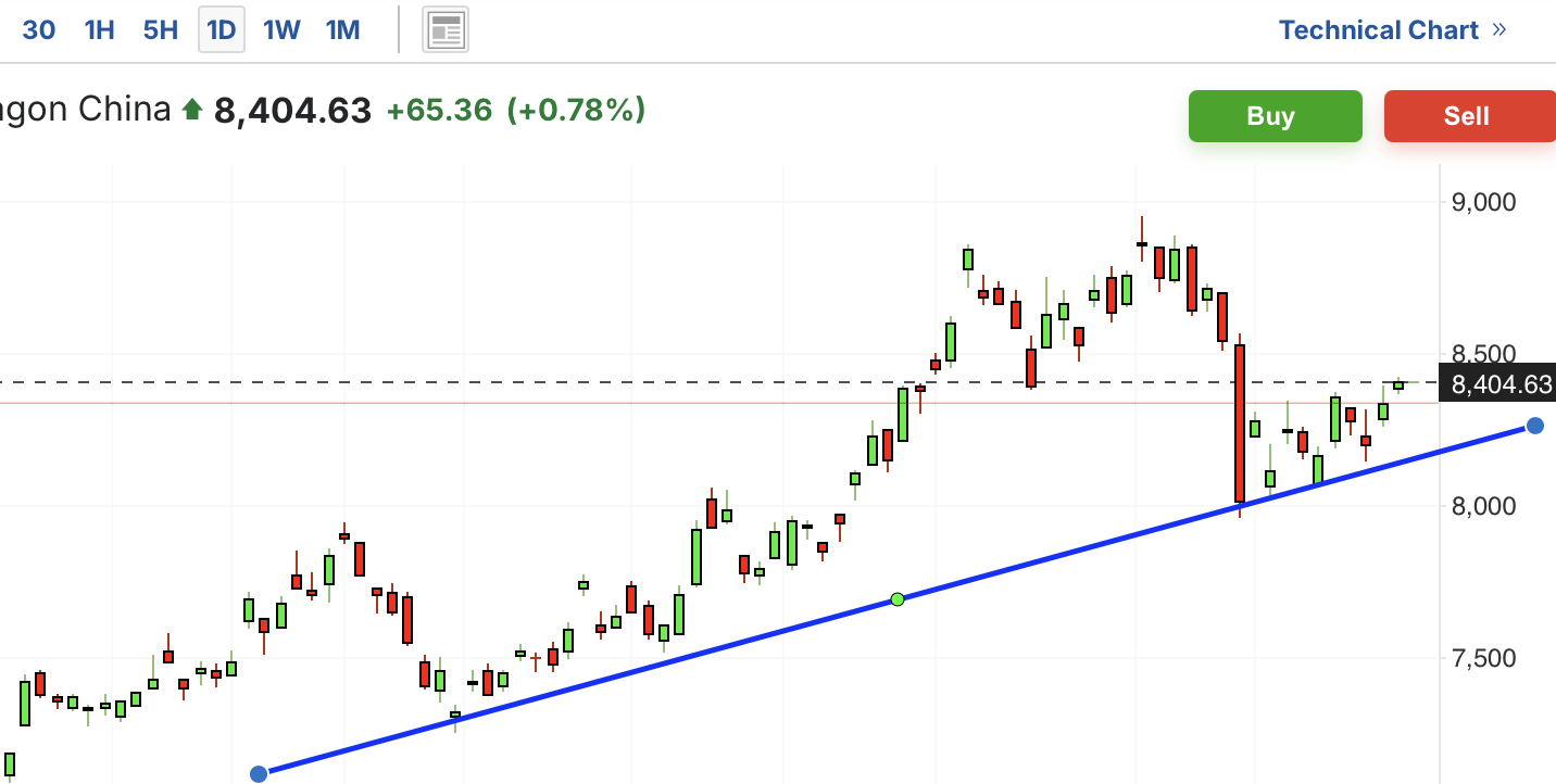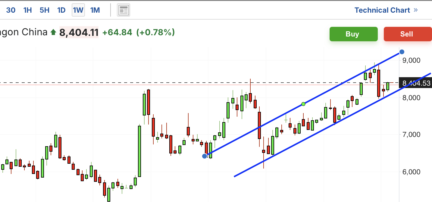 中概股此前突破压力位,后很快受阻回调,这几日守住短期上涨趋势线,横盘震荡中。中期趋势进入上升通道,最近守住支撑位,继续沿着通道震荡上行。