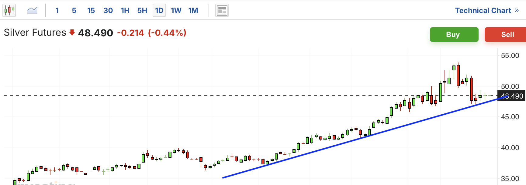 黄金和白银最近突破压力位,震荡上行。最近大幅拉升后形成超买,这几日大幅回落,目前刚好逼近上涨趋势线附近,目前还不确定止跌,能否守住支撑决定后市走向。