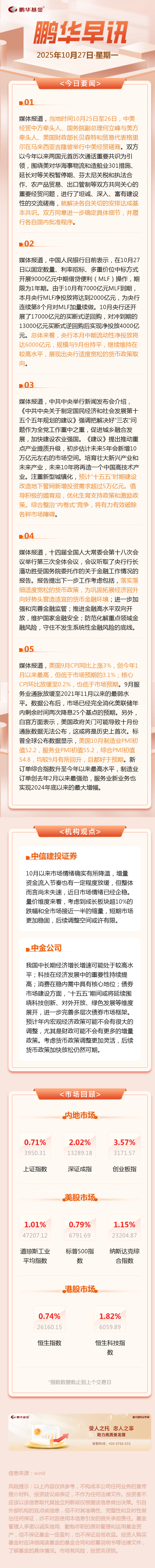 鹏华早讯10.27 中美就解决各自关切的安排达成基本共识