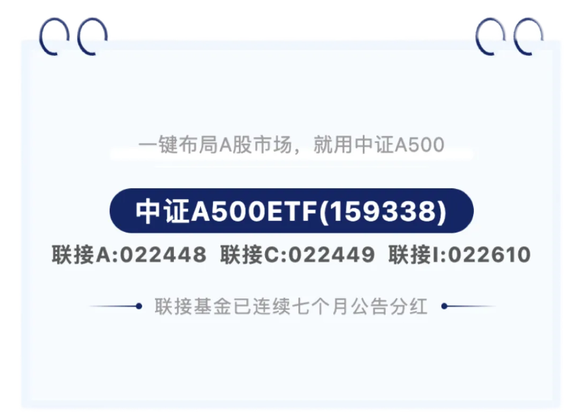 利润数据来源:基金2025年中报,其余数据来源:国泰基金、Wind 。最新规模截至2025年10月14日,规模随市场动态变化,仅供参考。累计服务客户数的数据区间为:2024年9月26日-2025年9月25日。业绩数据区间为:2024年10月15日(上市日)-2025年10月14日,区间内中证A500ETF场内涨幅为18.66%,沪深300指数涨幅为14.58%,超额收益为4.08%,指数、基金短期涨跌幅不预示未来表现。联接基金已于2025年4月-10月连续7次分红。 风险提示:市场观点将随各因素变化而动态调整,不构成投资者改变投资决策或选择具体产品的依据。上述ETF基金属于股票型基金,其预期收益及预期风险水平高于混合型基金、债券型基金和货币市场基金。上述ETF基金为指数型基金,跟踪标的指数,其风险收益特征与标的指数所表征的市场组合的风险收益特征相似。上述联接基金的目标ETF为股票型指数基金,其预期收益及预期风险水平理论上高于混合型基金、债券型基金和货币市场基金,基金主要通过投资于目标ETF跟踪标的指数表现,具有与标的指数以及标的指数所代表的证券市场相似的风险收益特征。投资者在投资前应仔细阅读《基金合同》、《招募说明书》、《产品资料概要》、风险揭示书等法律文件,了解基金的风险收益特征,并根据自身的投资目的、投资期限、投资经验、资产状况等判断基金是否和您的风险承受能力相适应。基金有风险,投资须谨慎。 中证A500ETF收益分配原则:1、本基金的收益分配方式为现金分红;2、基金管理人可每月对基金相对业绩比较基准的超额收益率以及基金的可供分配利润进行评价,收益评价日核定的基金净值增长率超过业绩比较基准同期增长率或者基金可供分配利润金额大于零时,基金管理人可进行收益分配;3、当基金收益分配根据基金相对业绩比较基准的超额收益率决定时,基于本基金的特点,本基金收益分配无需以弥补亏损为前提,收益分配后基金份额净值有可能低于面值;当基金收益分配根据基金可供分配利润金额决定时,本基金收益分配后基金份额净值不能低于面值,即基金收益分配基准日的基金份额净值减去每单位基金份额收益分配金额后不能低于面值;4、在符合上述基金分红条件的前提下,本基金可每月进行收益分配。评价时间、分配时间、分配方案及每次基金收益分配数额等内容,基金管理人可以根据实际情况确定并按照有关规定公告;5、每一基金份额享有同等分配权;6、法律法规或监管机构另有规定的,从其规定。在不违反法律法规、基金合同的约定以及对基金份额持有人利益无实质性不利影响的情况下,基金管理人在履行适当程序后,可调整基金收益的分配原则和支付方式,但应于变更实施日前在规定媒介上公告。 中证A500ETF联接收益分配原则:1、本基金收益分配方式分两种:现金分红与红利再投资,基金份额持有人可选择现金红利或将现金红利自动转为相应类别的基金份额进行再投资;若基金份额持有人不选择,本基金默认的收益分配方式是现金分红;基金份额持有人可对 A 类、C 类和 I 类基金份额分别选择不同的分红方式;2、基金管理人可每月对本基金相对业绩比较基准的超额收益率以及本基金的可供分配利润进行评价,收益评价日核定的基金份额净值增长率超过业绩比较基准同期增长率或者基金可供分配利润金额大于零时,基金管理人可进行收益分配。本基金可每月进行评价及收益分配,基金收益评价日、分配时间、分配方案及每次基金收益分配数额等内容,基金管理人可以根据实际情况确定并按照有关规定公告;3、由于本基金 A 类基金份额不收取销售服务费,而 C 类和 I 类基金份额收取销售服务费,各类别基金份额对应的基金份额净值增长率或可供分配利润将有所不同,本基金同一类别的每一基金份额享有同等分配权;4、法律法规或监管机构另有规定的,从其规定。在不违反法律法规、基金合同的约定以及对基金份额持有人利益无实质性不利影响的情况下,基金管理人在履行适当程序后,可调整基金收益的分配原则和支付方式,但应于变更实施日前在规定媒介上公告。 鉴于上述基金特点,基金分红不一定来自基金盈利,基金分红并不代表总投资的正回报。具体分红条款详见基金合同。