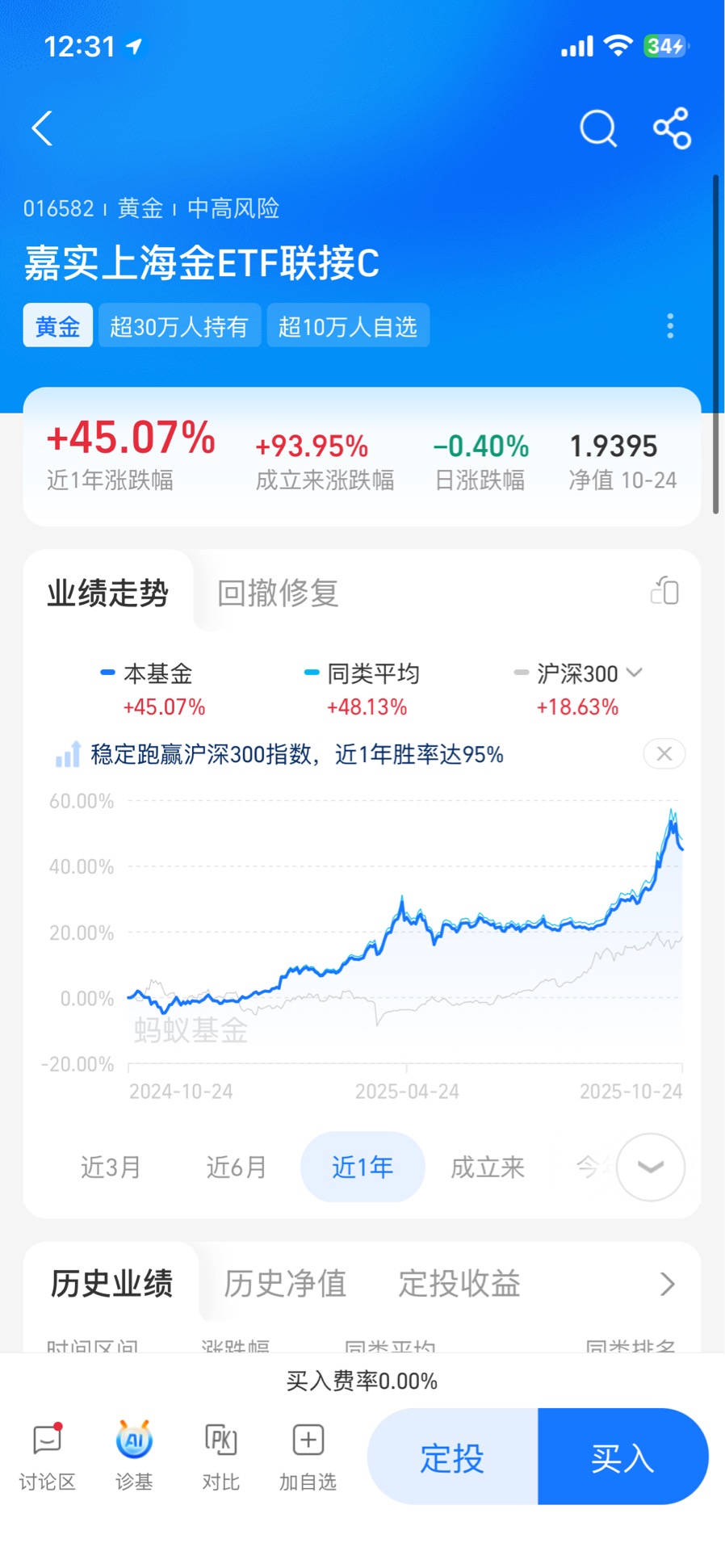 今天黄金小幅震荡,正是给了机会呀,这支$嘉实上海金ETF联接C$ 近期势头肉眼可见的猛。关键这基金持仓特纯粹,核心就是跟踪上海金价格,相当于用极低成本直接布局实物黄金,很划算!而且全球利率还在下调,加上全球央行一直在买金,去美元化趋势又明显,再加上美联储降息是板上钉钉了,黄金长期上涨的支撑特别足。嘉实基金的金字招牌也靠谱,管理规模超万亿,打理这类ETF联接基金经验超丰富。这支近一年涨幅45.07%,继续看好