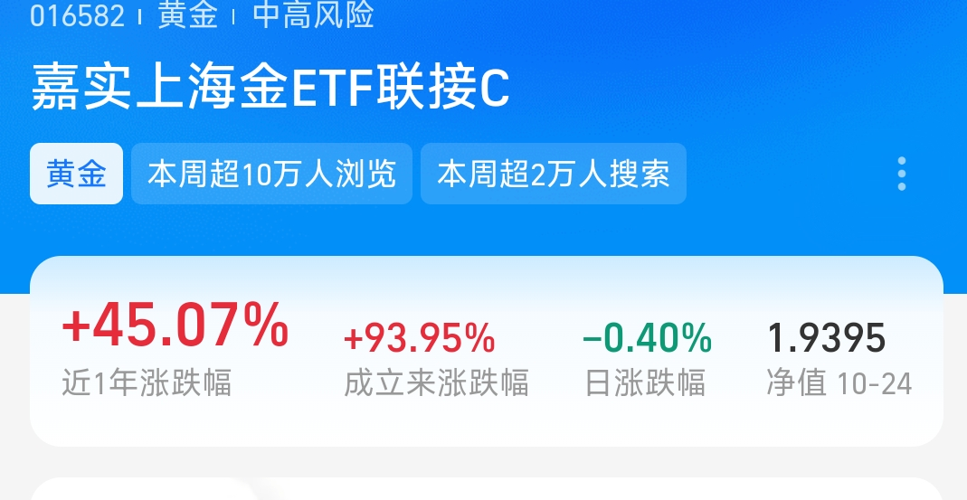 高位的黄金并没有啥,又不是说涨不上去,去年600多的时候还不是说高了,今年的黄金900多了,后续还有可能更高的价格,这要看外围的这个情绪面了,我今天小补$$嘉实上海金ETF发起联接C$ 年内黄金的上涨50的涨幅,这力度还是比较强势的,白银方面70%,对比黄金我更加倾向这一类的资产,还能抗通胀,全球央行购金量连创新高,中国、俄罗斯、印度等国家黄金储备持续增加,去美元化趋势明显。等待后续继续涨一波吧!这个还是7免呢