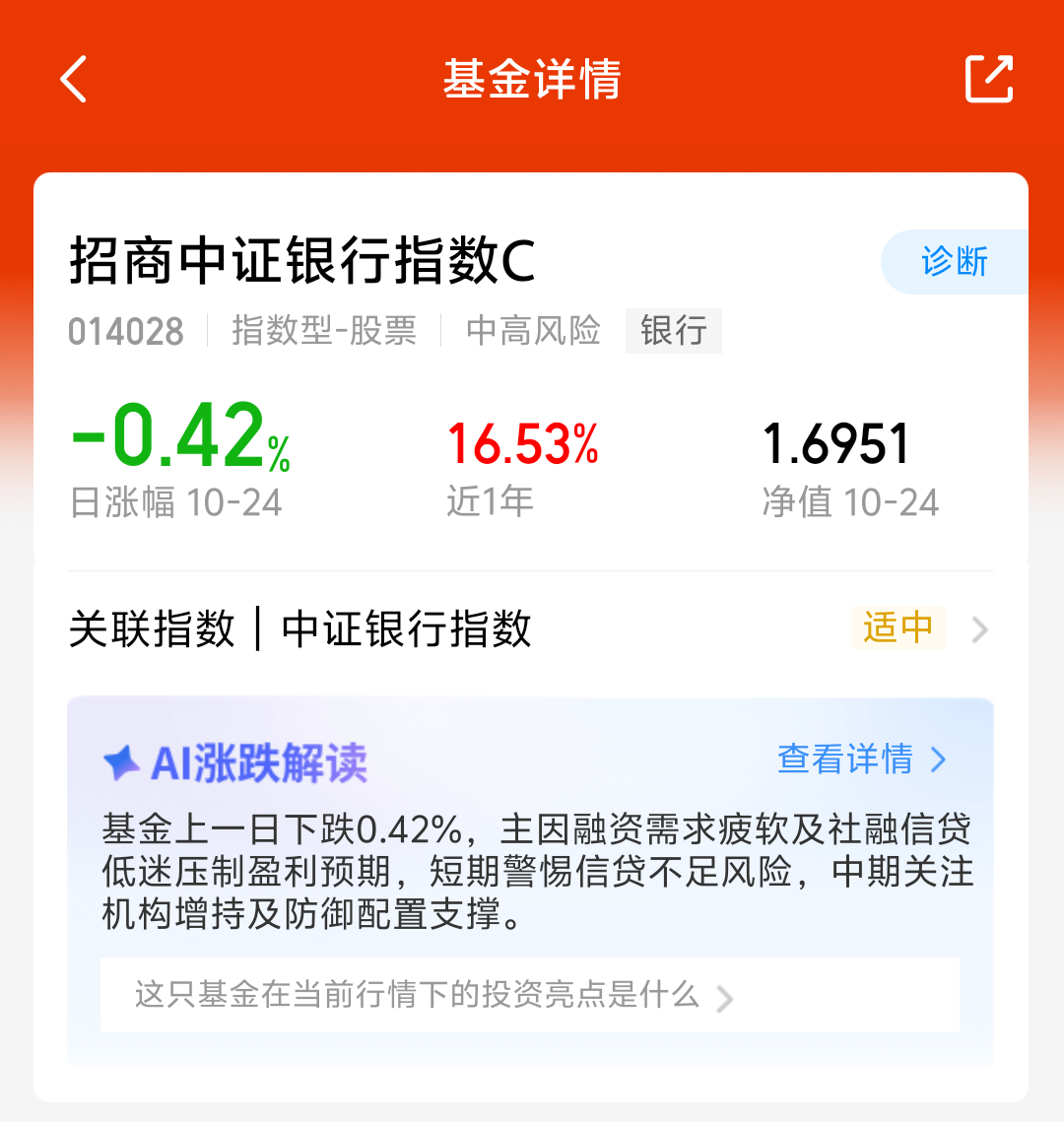 大盘今天继续大涨,银行板块今天也涨起来了,近期市场波动加剧,红利板块避险属性升温,$招商中证银行指数C(OTCFUND|014028)$近一周涨了1.31%,近一年涨了16.53%,长期来看业绩还不错,大科技等板块波动比较大,银行板块作为持仓中的压仓石很不错,看好这个方向,我准备分批加仓了!
