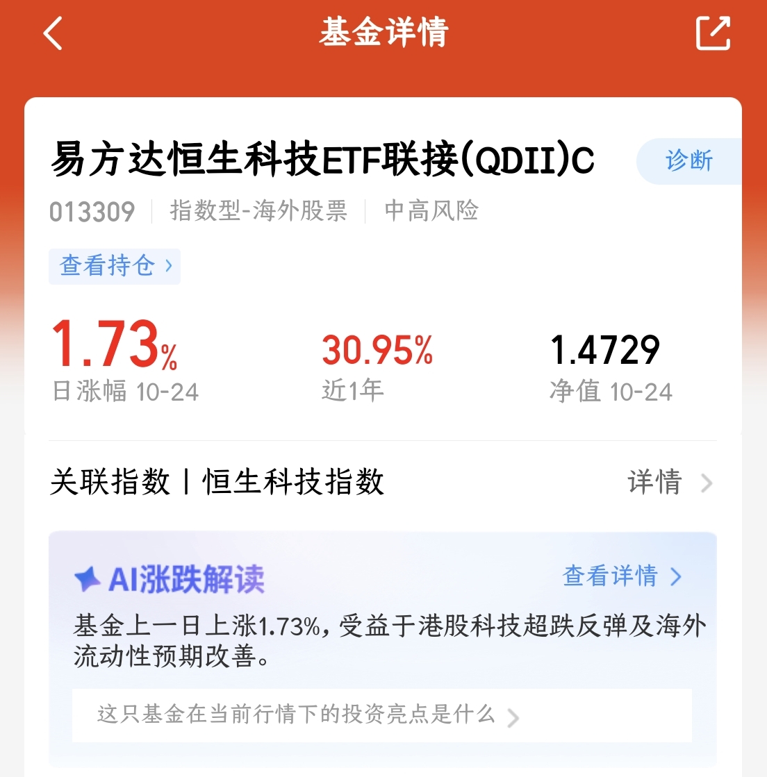 今天股市行情不错,迎来开门红,港股表现也是可圈可点。随着美联储降息预期强化推动全球流动性改善,港股科技板块迎来外资回流机遇。与A股相比,恒生科技指数涨幅滞后,但核心企业如腾讯、阿里基本面稳健,盈利持续回暖,估值仍处历史低位区间。$易方达恒生科技ETF联接(QDII)C(OTCFUND|013309)$紧密跟踪指数表现,当前估值洼地与盈利修复形成共振,配置价值凸显。流动性改善与基本面支撑双轮驱动下,港股科技板块补涨动能充沛,有望迎来新一轮估值修复行情,今天继续加仓了!