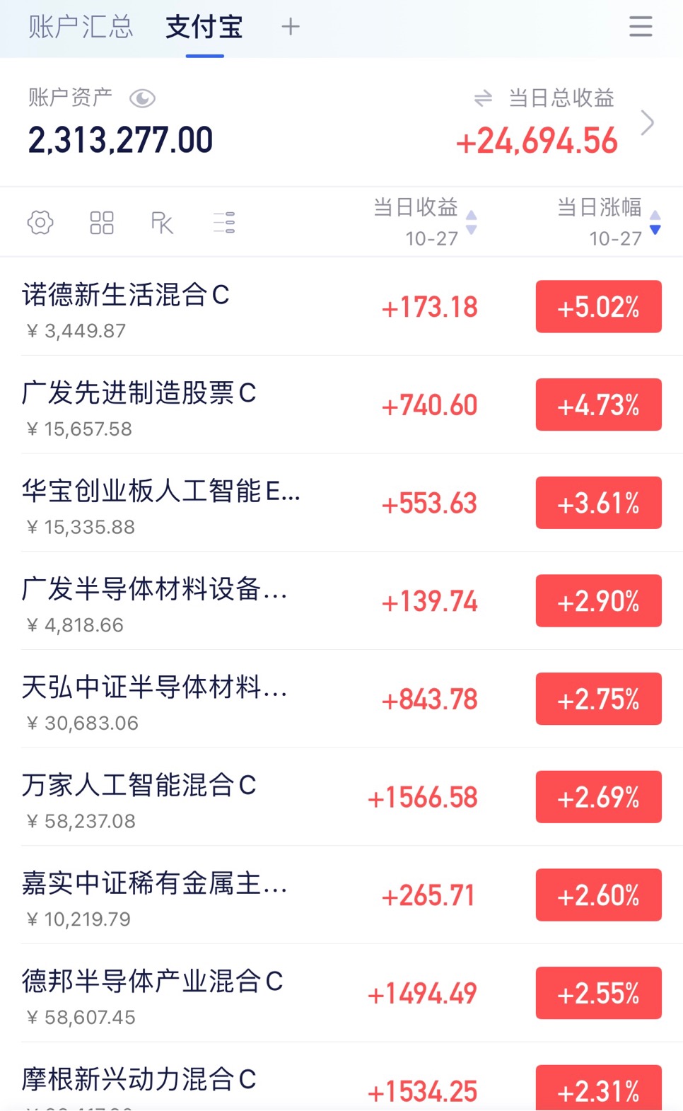 操作上,上周星期五上涨了8%,今天依旧处于反弹节奏中,上涨了1%,个人今天追加10,000,一方面,人工智能,这条主线没有熄火,科技成长还会水涨船高,另一方面,基金持仓来看,互联网龙头、半导体设备,原材料等相关筹码黄金坑筹码便宜,还有上涨空间
