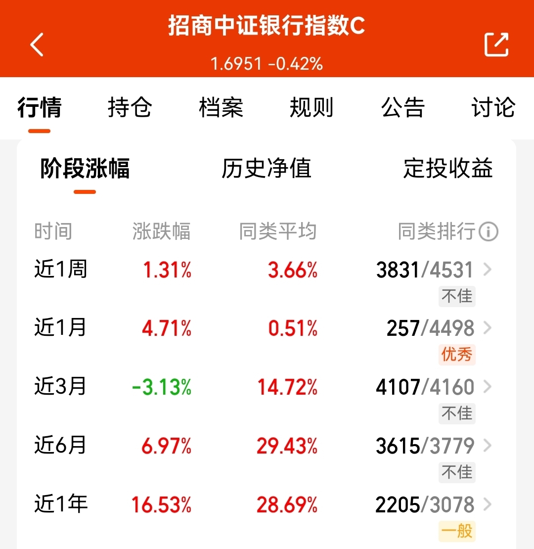 这支$招商中证银行指数C$ 主要跟踪银行板块,前期调整多,近期也有反弹预期,近1年也涨了16.53%了,还是跑赢红利板块的;
