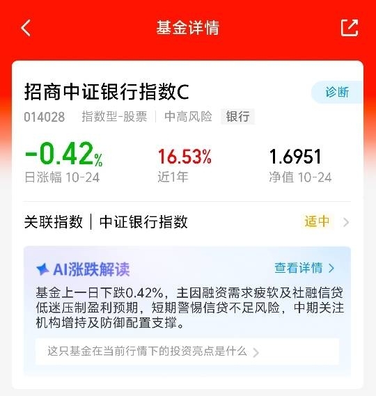 最近股市行情不错,大盘连着涨了好几天。我注意到银行板块也开始发力了,招商中 证银行指数C这一周涨了1.31%,看长期表现更稳,近一年收益率有16.53%。现在市场震荡比较明显,科技股这些波动太大,相比之下红利板块就显得更稳妥些。我觉得银行板块作为资产配置的稳定器挺合适的,打算把手里的资金分成几笔慢慢加仓。虽然短期可能有波动,但长期拿着心里比较踏实。