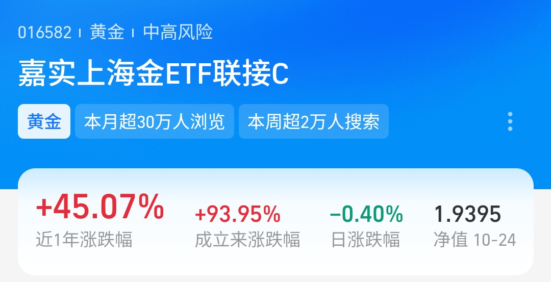 $嘉实上海金ETF发起联接C$ 近一年硬生生涨了45.07%,实力摆在那。现在回调不就是捡漏的好时候嘛,纠结啥?我今儿果断布局一波,毕竟这种行情