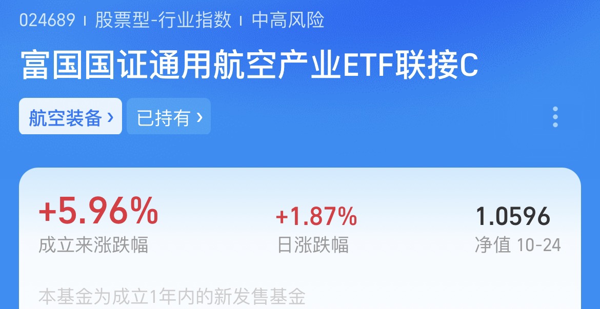 军工板块经过了前面的洗盘调整,下半年来看行情整体趋势向好。今天股市上涨,航空装备板块在大盘的带动下,小幅上涨。$富国国证通用航空产业ETF发起式联接C$ 主要投资的是军工产业,前十重仓股包括航天电子、海格通信、华测导航、航天彩虹、洪都航空等,全方位的涉及航空航天制造、通信导航等等通用航空产业的细分领域,可以吃到整个航空产业的行情。成立以来(105天)涨幅5.96%,从未来前景看,它紧紧跟踪GJ领导,也是新质生产力的重要主线之一,在政c的助力催化下,我个人认为行业发展速度是比较快的,今天也小投一笔,打算长期拿着,看看后市行情