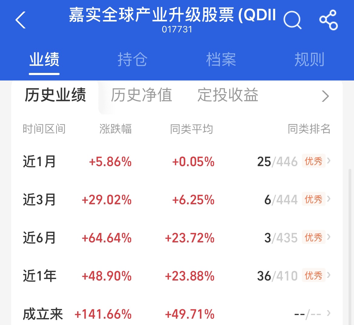 近期全球经济表现活跃,考虑到该基金港股和A股都有投入,多元化的区域市场可以降低单一市场的风险。$嘉实全球产业升级股票发起式(QDII)C$ 主要投资的是科技龙头企业,抓住了AI科技浪潮,从半导体到互联网科技都有涉及,重仓股英伟达、新思科技、超威半导体、中芯国际等等研发创新以及利润增长都不错。高弹性和高成长的特性,也取得了超额收益。近三月上涨29.02%,近半年上涨64.64%,成立以来涨幅141.66%,短期波动和中长期业绩都亮眼。科技行业后面上涨空间也大,我个人是看看行情,考虑加仓!