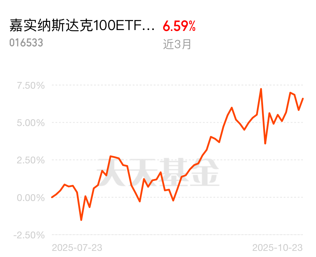 #美方“不再考虑”对中国加征100%的关税# 现在已经进入了美股财报季,加上美联储降息更加确定,提前配置美股更是不错的选择,$嘉实纳斯达克100ETF发起联接(QDII)C人民币$ 单日额度5000元,虽然不是最高,但是已经是很不错的了,提高埋伏布局够用了,中美关系也在慢慢缓和,风险降低,一切都是朝着利好方向走的,所以可以考虑上车了!