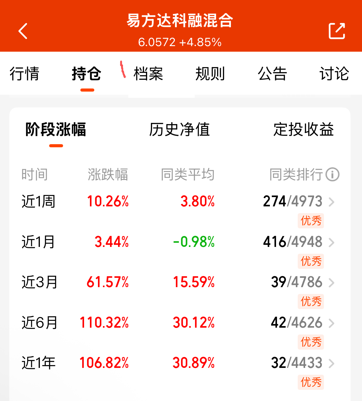 先恭喜大家!我们要见证历史了,4000点马上就要来了!大家主要冲哪个方向,我的话还是历史优秀的混合基,省的自己追热点了,易方达可溶混合近一周10.26%,大爆发,最近的业绩也是很不错的。经理调仓给力,拿稳等肉吃。