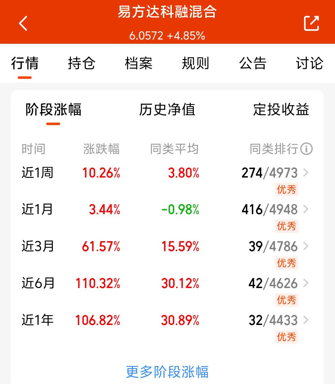 大盘今天继续大涨,上证指数接近4000点,大科技板块大涨,近期市场波动比较大,成长行情轮动速度很快,易方达科融混合持仓比较均衡,持仓有科技、新能源和军工轮动配置,近六个月涨了110.32%,业绩不错,经理调仓能力也很不错,看好这个方向,我准备分批加仓了!