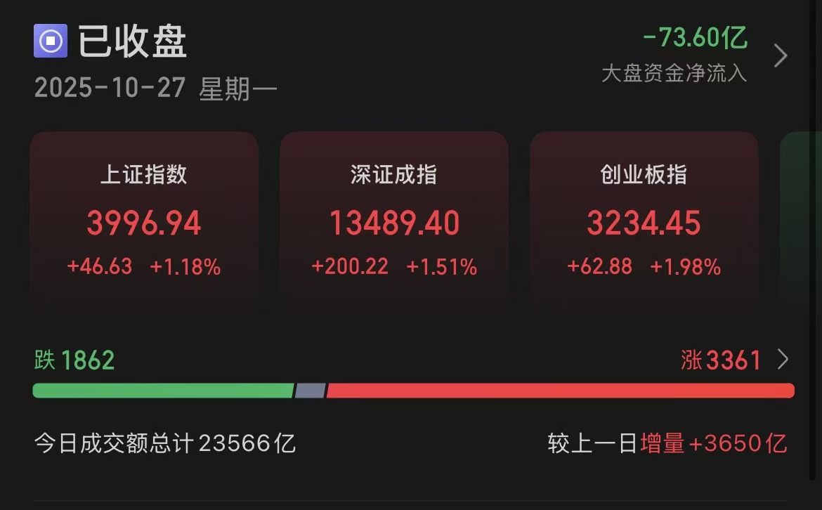 指数表现,沪指上涨1.18%,深成指上涨1.51%,创业板指上涨1.98%。个股涨多跌少,全市场3361只个股上涨,下跌个股1862只。沪深京市场全天成交额2.35万亿,较上个交易日增量3650亿。
