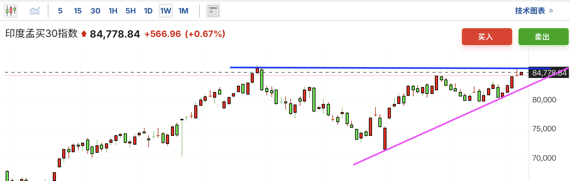 印度指数近期在上行途中受阻,最近一直处于盘整期,这几日突破关键压力位,涨回最高点附近,如果突破,那么再次开启上行模式。