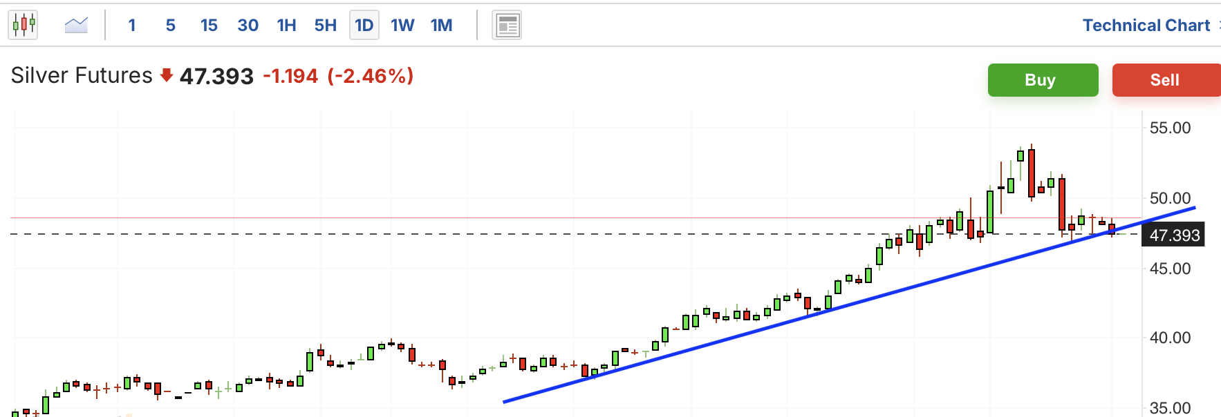 黄金和白银最近突破压力位,大幅拉升,但很快因超买而大幅回落,这两日还跌破短期上涨趋势线,如果确定跌破,那么进入回调阶段。