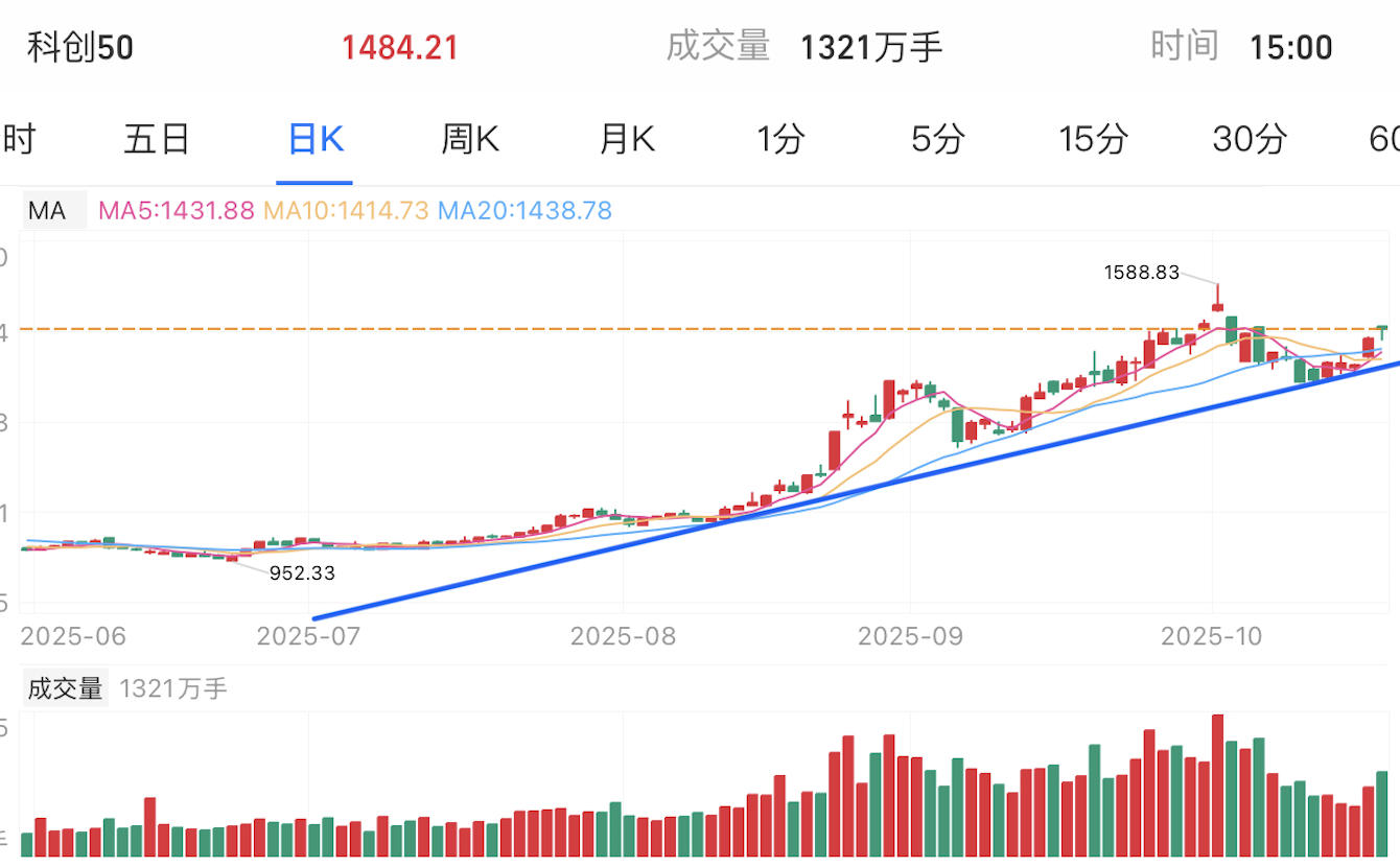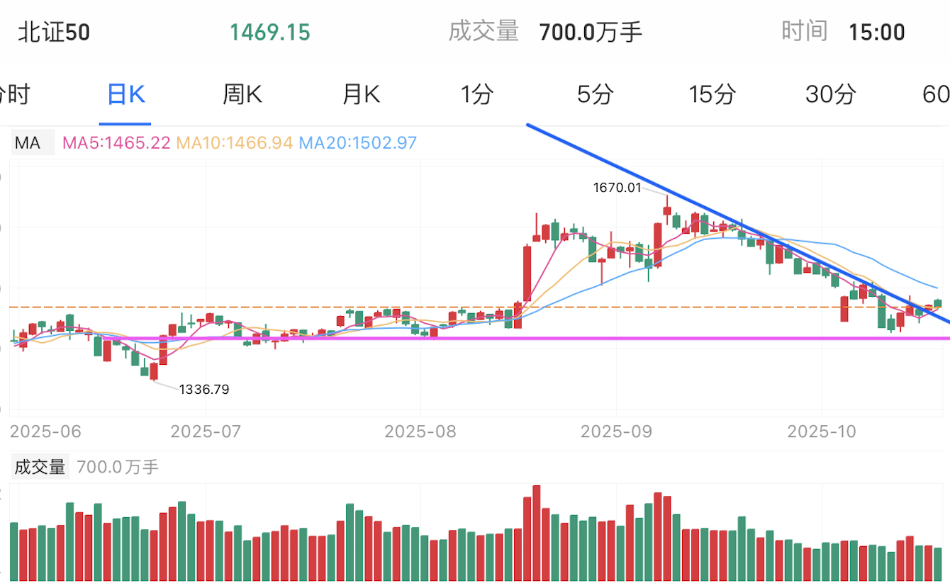 北证50 短期趋势下行,这两日在前低支撑位反弹,有止跌迹象,但周一是全市场唯一下跌的指数,目前仍处于盘整期。科创50在上涨趋势线附近止跌,周一大幅反弹,止跌回升,暂时没有突破前高压力位。