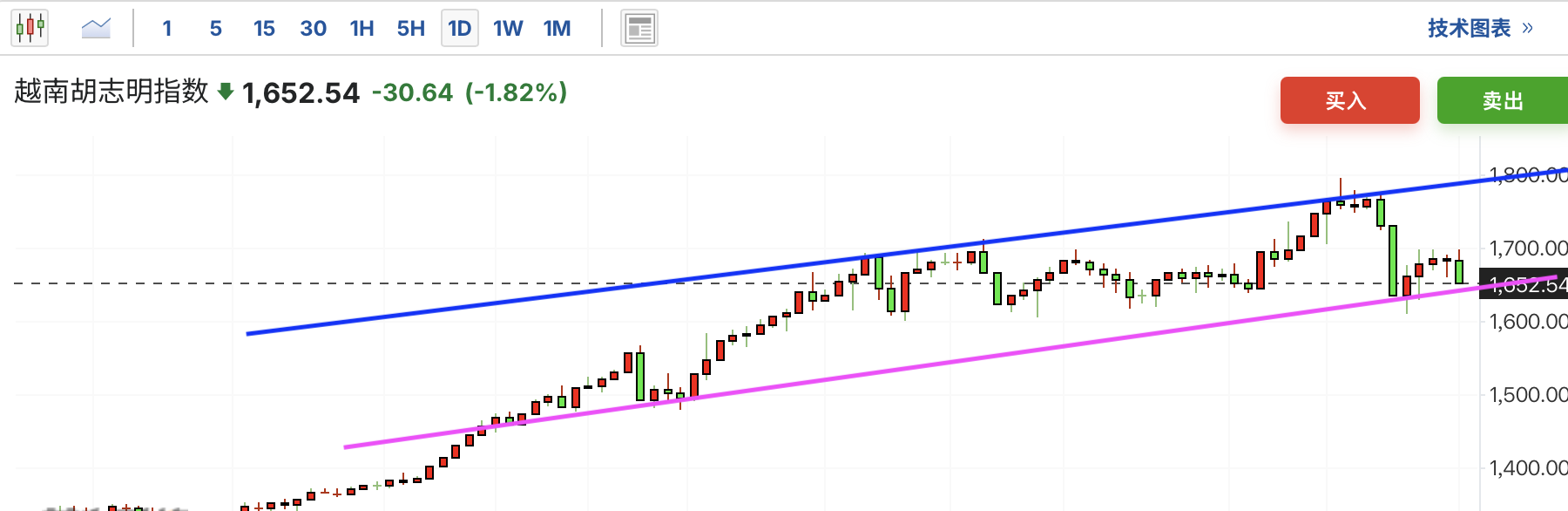 日经指数、越南指数和台股加权指数近期一直沿着上升通道震荡上行,最近剧烈波动,暂时没有脱离上升通道,但逼近通道的压力位和支撑位,跌破则出现超买或回调状态,给后市带来风险。