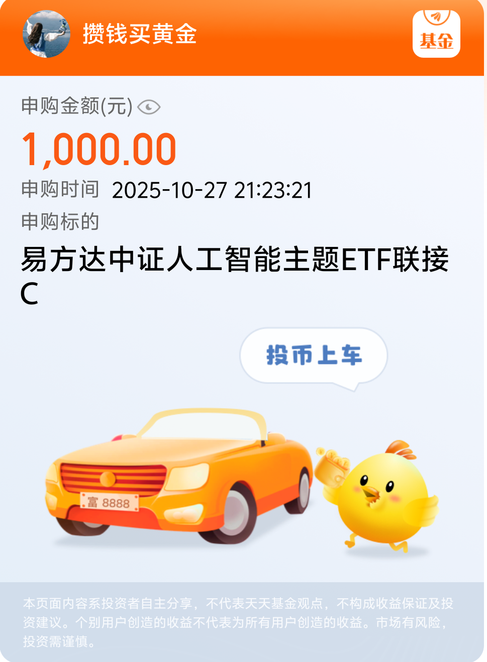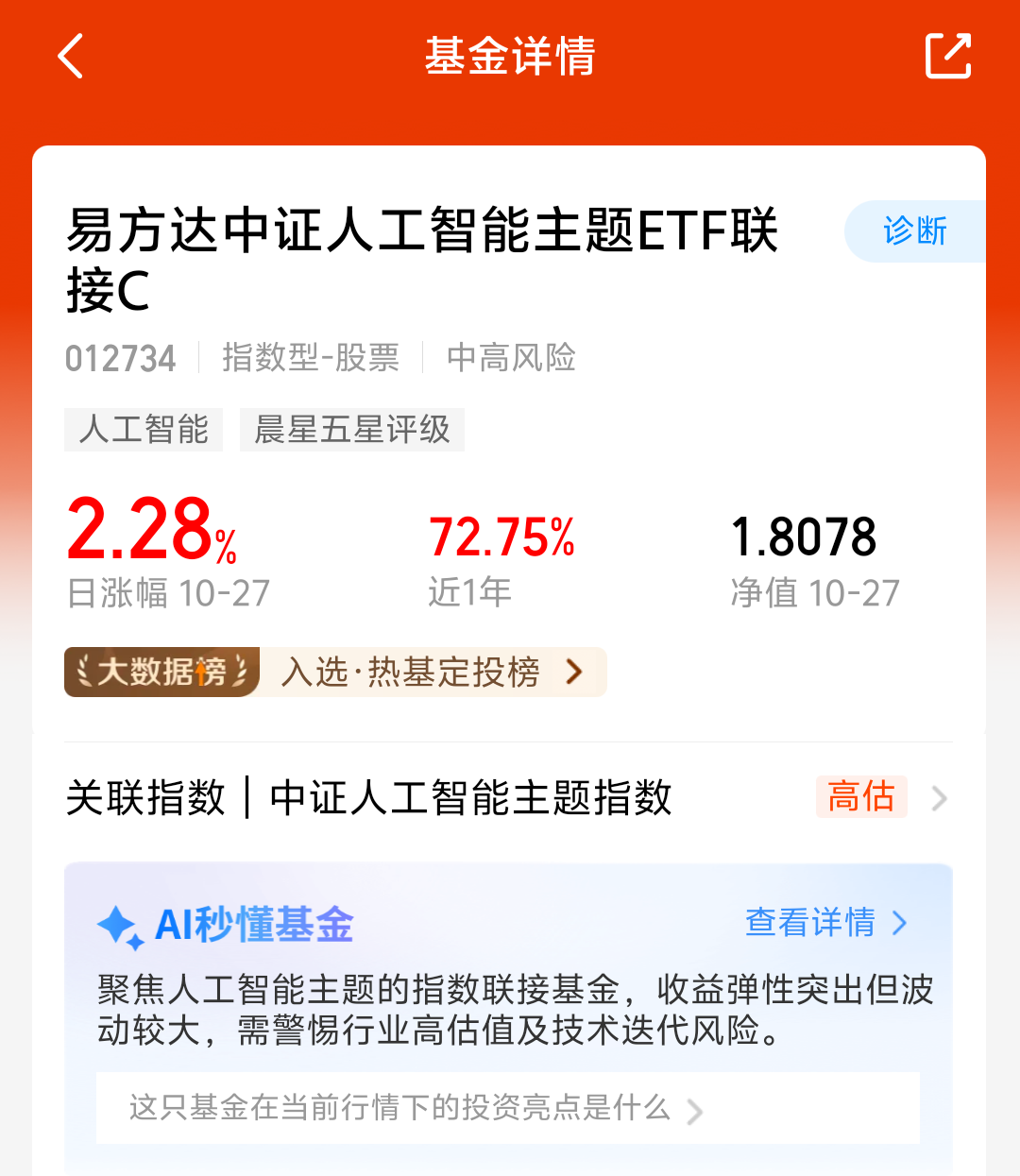 大盘今天表现不错,三大指数继续上涨,上证指数接近4000点了!人工智能板块今天大涨,易方达中证人工智能主题联接C今天涨了2.28%,近一年涨了72.75%,人工智能长期来看发展前景还是很不错的,看好这个方向,今天加仓1000元!之后我打算继续分批加仓了!