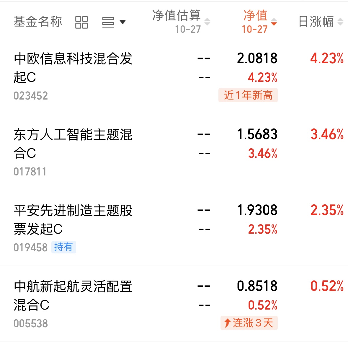 今天真的给我狠狠回了一口啊!$中欧信息科技混合发起C(OTCFUND|023452)$涨4.23%,创近一年新高,厉害了,修复的这么快啊!