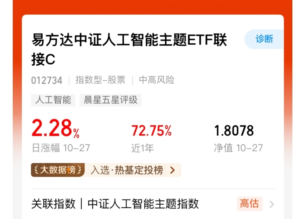 易方达中证人工智能主题c今日收涨2.28%,近期业绩稳定,波动小回撤低,希望继续保持