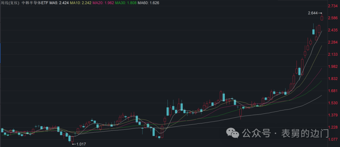 之前提过的中韩半导体ETF(513310),今日大涨超4.5%,年内收益超过80%,剔除个别港股创新药etf后,已经成为今年QDII基金的收益top1,其去年以来的走势图,长下面这样。