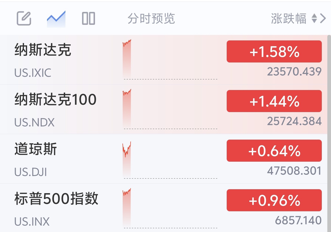 又是涨,今晚上美股行情一路上涨,表现的非常的强势。到目前为止,纳斯达克上涨了1.58%,纳斯达克100指数上涨了1.44%,目前还在拉伸上涨中,随着市场情绪的高涨,也迎来了配置窗口期。