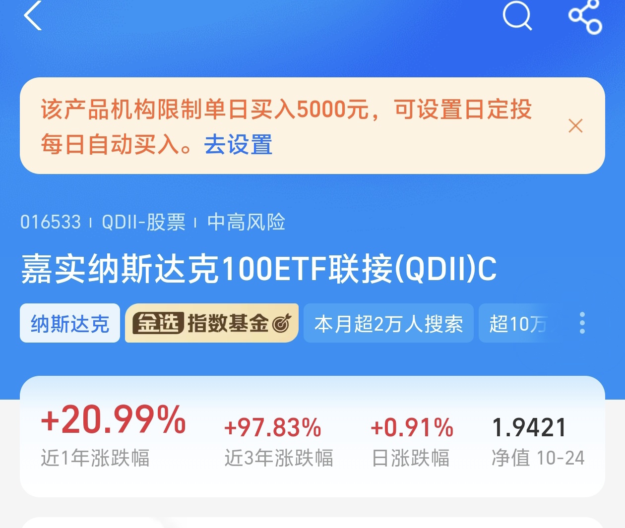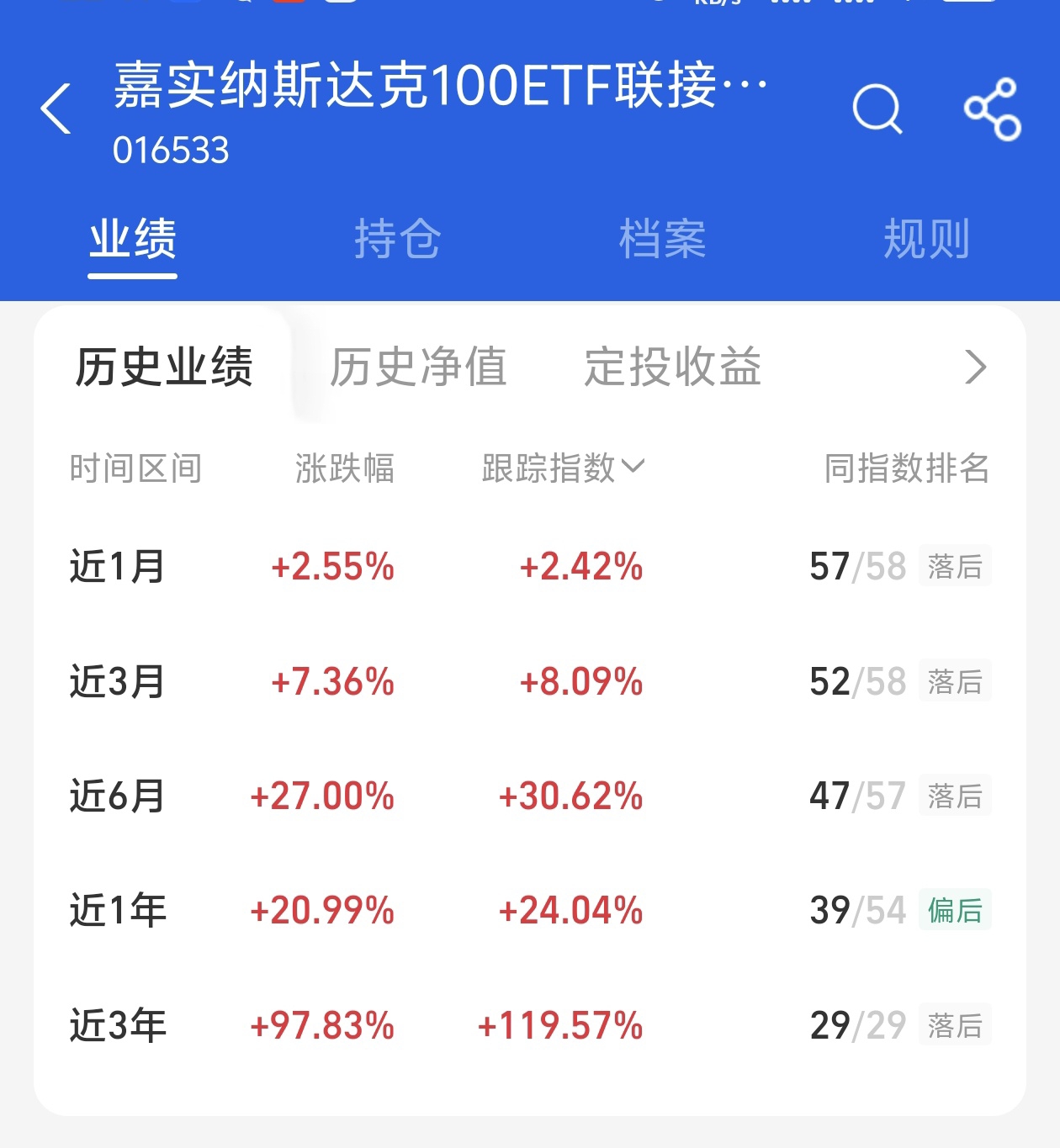 $嘉实纳斯达克100ETF发起联接(QDII)C人民币$ 表现的也是非常的优秀。今天晚上单日上涨了0.92%,近三个月上涨了7.36%,近六个月的收益率高达27%,收益率高。基金精准的跟踪了达克100指数,综合费率低。基金上涨弹性大,爆发力强。已经成分股涵盖了苹果,微软,英伟达等全球科技巨头。这些企业都有强大的技术“护城河”和垄断地位,企业营收利润高。随着目前科技行业创新速度快、AI、量子计算,生物科技等领域不断的突破,将迎来新一轮的上涨,长期持有,投资性价比高,期待后期收益。
