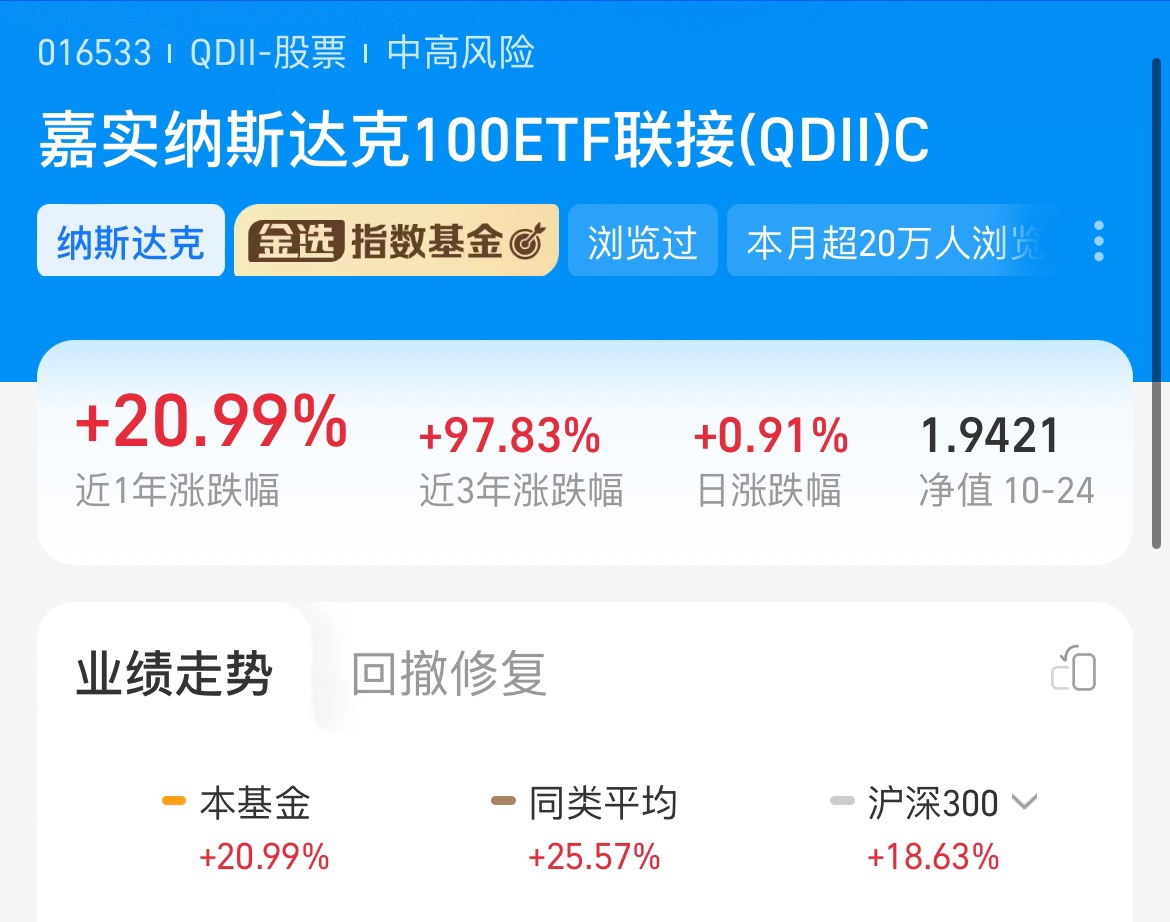今天股市整体走势挺可观的,大盘没有大起大落,始终保持着稳中有涨的节奏,各个板块的活跃度也比之前提升了不少,能明显感觉到市场的韧性在慢慢显现,整体运行状态很积极,让人看了心里也踏实。我之前观望了一阵,今天终于决定上车的$嘉实纳斯达克100ETF发起联接(QDII)C人民币$ 今晚最新涨幅有0.91%,短期走势很稳。再翻了翻长期业绩更惊喜,近三年竟然涨了97.83%,不管是短期波动中的表现,还是长期的收益能力,都挺符合预期的,选到这只基金还挺让人开心的。加油!