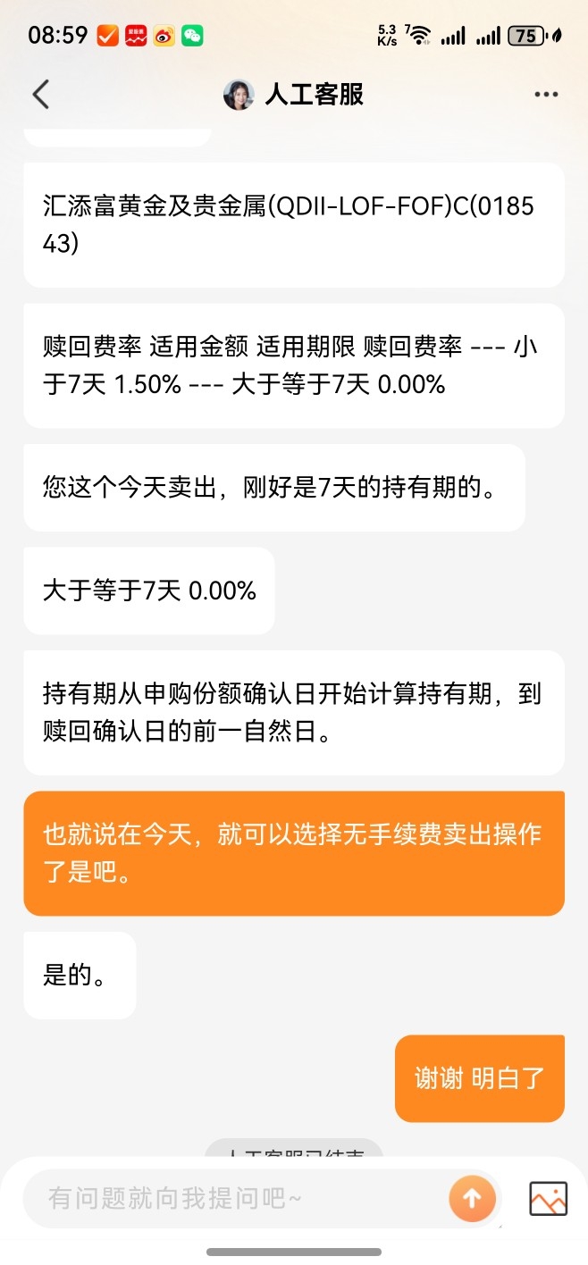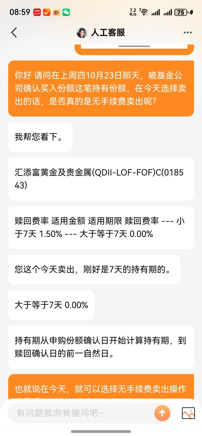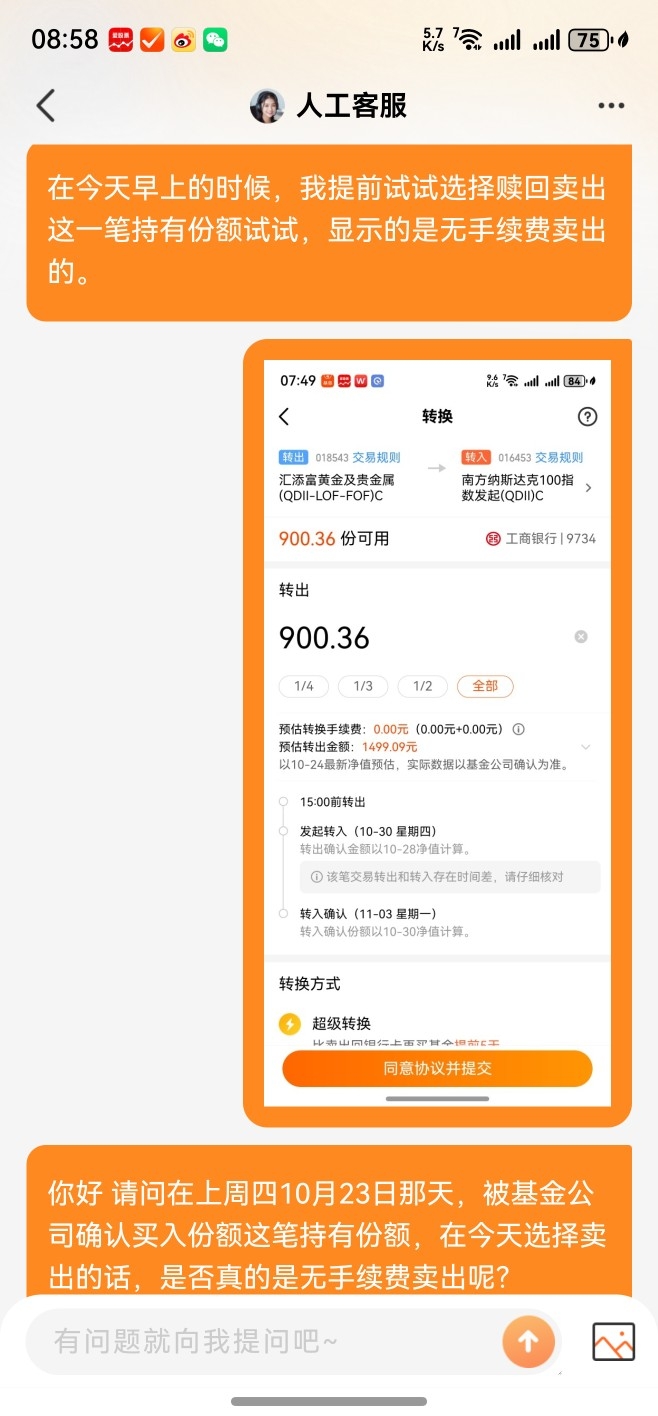 在今天上午的时候,已经向天天基金平台上的人工客服,再次询问在今天是否可以真的选择无手续费卖出某个黄金及贵金属qdll基金这个问题了。