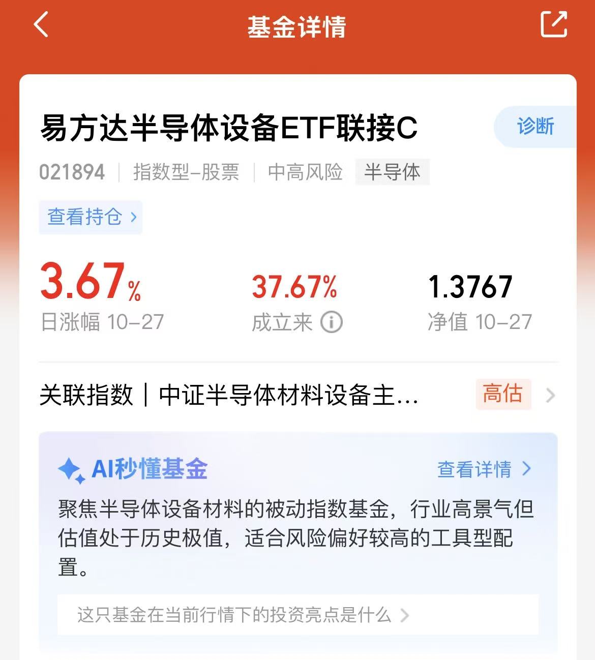 近期半导体设备反弹还是挺强的呀,易方达半导体设备ETF联接C昨天上涨3.67%,表现优秀,眼下全球半导体市场在走出低谷后需求不断的增加,技术上也在不断的突破,AI发展催化生出大量存储需求,还有国产替补的脚步也在加快,所以我觉得这个方向是不错的呢,我也分批慢慢的布局起来,相信一定会收获满满的!