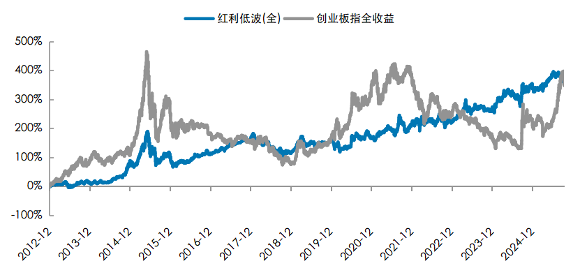 图:红利低波指数与创业板指的长期累计收益比较(全收益)