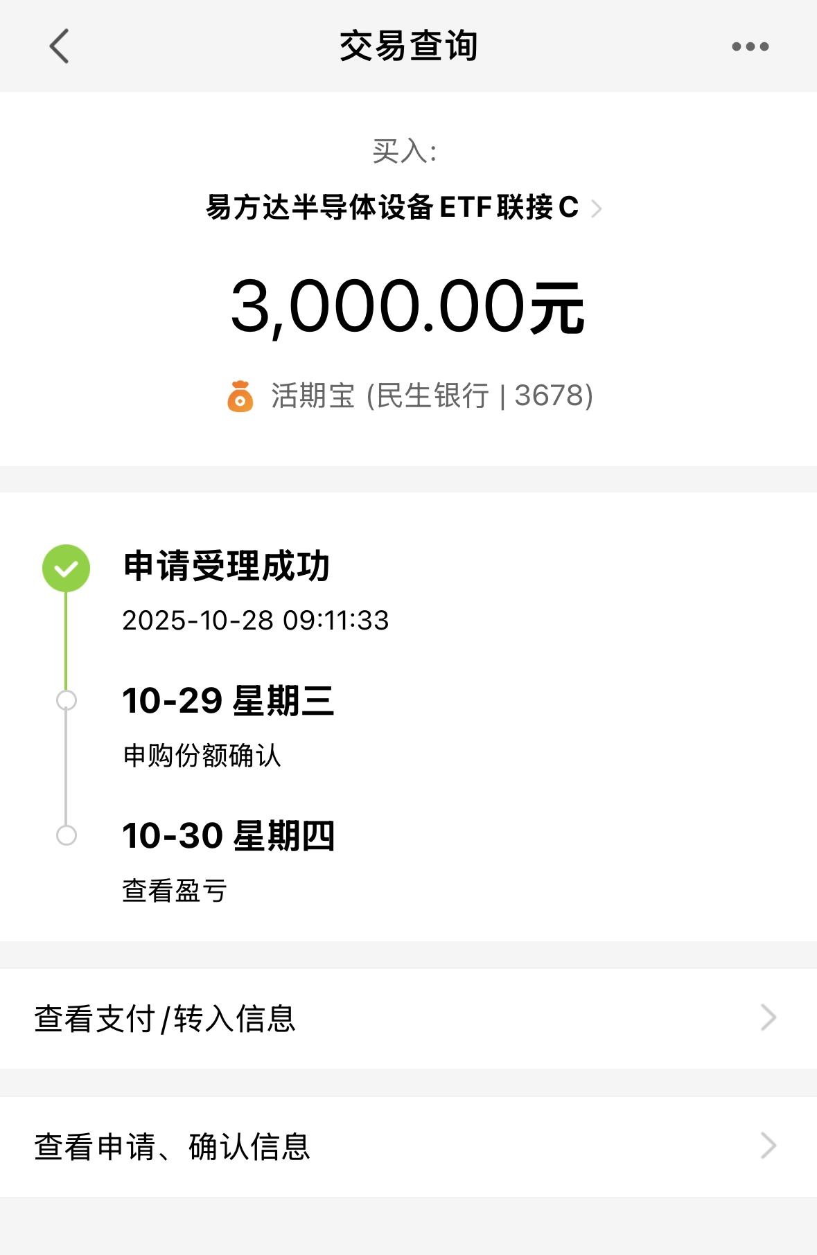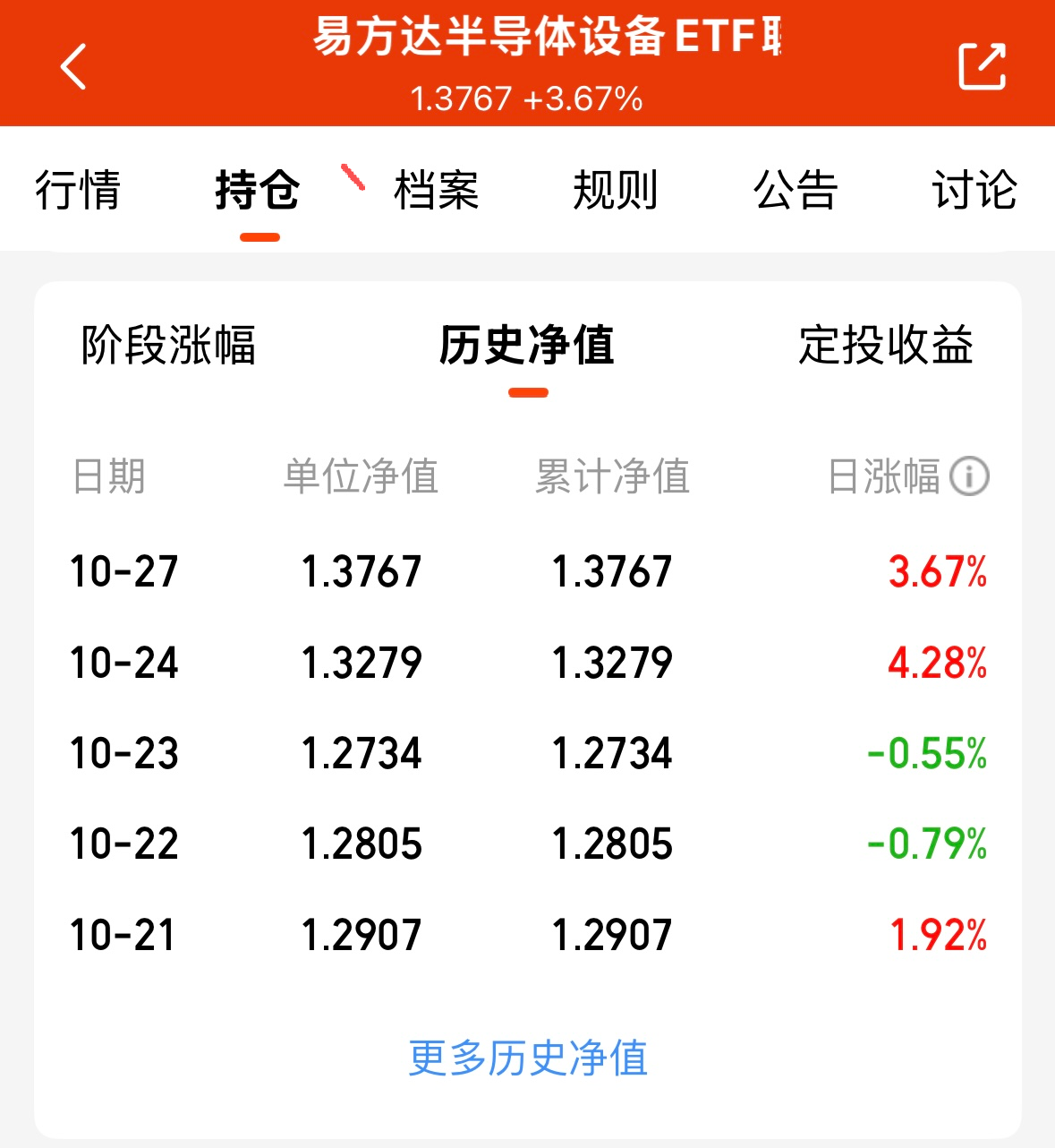历史性的今天啊!沪指突破4000点,创十年新高。看很多友友恐高了,我还是比较有信心的。今天加仓易方达半导体设备C,最近半导体设备比较火了,昨天收涨3.67%,周五收涨4.28%,给力,今天也是小红。储存芯片行情后面还有比较大机会,等调整慢慢补。