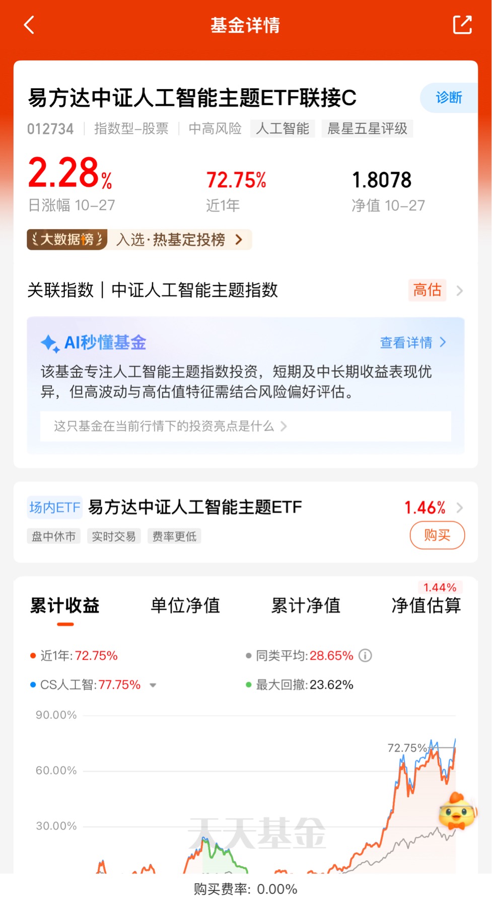 对于看好AI产业长期前景、希望便捷参与相关行情的投资者,易方达中证人工智能主题ETF联接C,目前估值约涨1.44%!