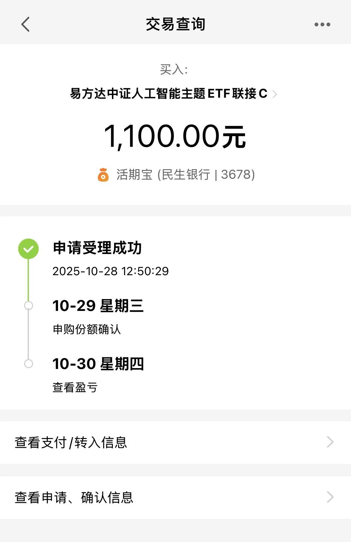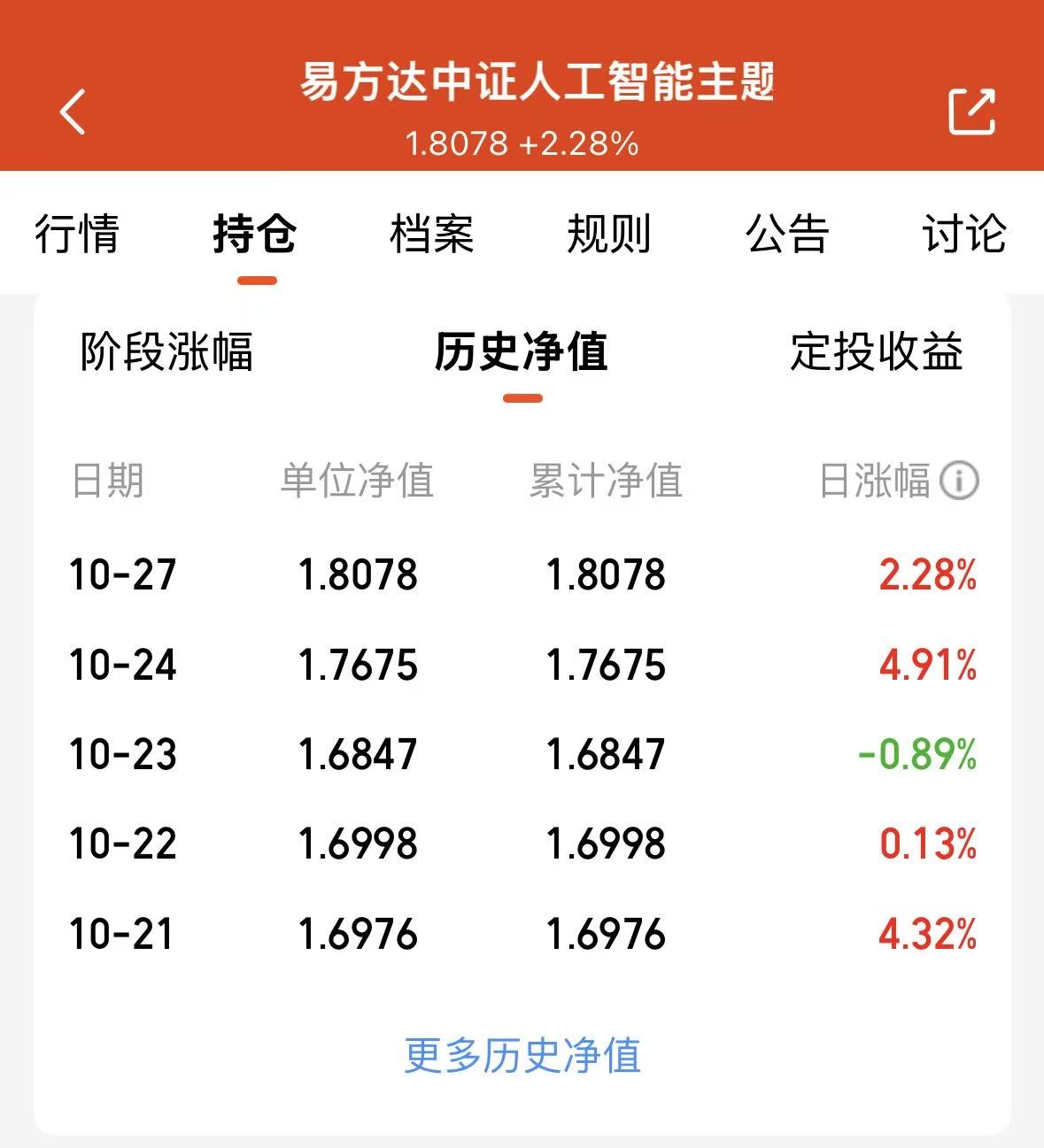 没减仓的继续吃肉!10月份比较难拿,考验心态,但是结果还是不错的,月底大众回血吃肉。易方达中证人工智能指数昨天涨了2.28%,周五涨4.91%,最近五个工作日表现都可以。人工智能行情,在政策催化下,我继续看多,国产自主逻辑不变,回调后仍是核心赛道。