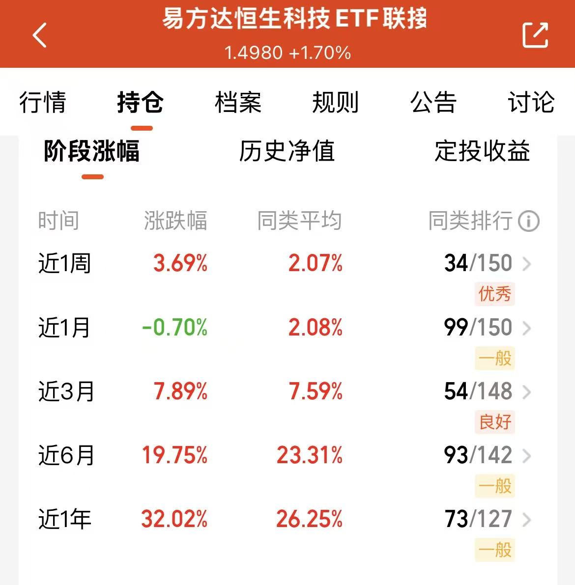 今天A股低开高走,港股这边高开回落,恒生科技指数下行0.33%,不过科技还是当前重要的主线,再加上美联储降息预期还在,港股科技弹性也会更大,$易方达恒生科技ETF联接(QDII)C(OTCFUND|013309)$年化收益率32.02%,综合费率0.31%,费率低,港股市场活力是比较强的,再加上南向资金流也在持续不断的流入,我继续看好未来!